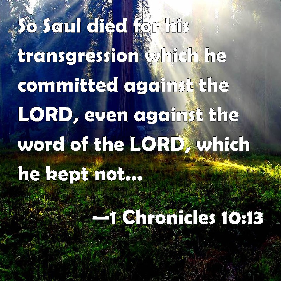 Choose a Background 1 Chronicles 10:13 So Saul died for his transgression which he committed against the LORD, even against the word of the LORD, which he kept not, and also for asking counsel of one that had a familiar spirit, to inquire of it; KJV: So Saul died for his transgression which he committed against the LORD, even against the word of the LORD, which he kept not, and also for asking counsel of one that had a familiar spirit, to inquire of it; DRB: So Saul died for his iniquities, because he transgressed the commandment of the Lord, which he had commanded, and kept it not: and moreover consulted also a witch, DBT: And Saul died for his unfaithfulness which he committed against Jehovah, because of the word of Jehovah which he kept not, and also for having inquired of the spirit of Python, asking counsel of it; ERV: So Saul died for his trespass which he committed against the LORD, because of the word of the LORD, which he kept not; and also for that he asked counsel of one that had a familiar spirit, to inquire thereby, WBT: So Saul died for his transgression which he committed against the LORD, even against the word of the LORD, which he kept not, and also for asking counsel of one that had a familiar spirit, to inquire of it; WEB: So Saul died for his trespass which he committed against Yahweh, because of the word of Yahweh, which he didn't keep; and also because he asked counsel of one who had a familiar spirit, to inquire [thereby], YLT: And Saul dieth because of his trespass that he trespassed against Jehovah, against the word of Jehovah that he kept not, and also for asking at a familiar spirit — to inquire, — Links 1 Chronicles 10:13 NIV • 1 Chronicles 10:13 NLT • 1 Chronicles 10:13 ESV • 1 Chronicles 10:13 NASB • 1 Chronicles 10:13 KJV • 1 Chronicles 10:13 Interlinear • 1 Chronicles 10:13 Commentaries • 1 Chronicles 10:13 Parallel Texts • 1 Chronicles 10:13 Bible Apps • 1 Chronicles 10:13 Parallel • Bible Hub |