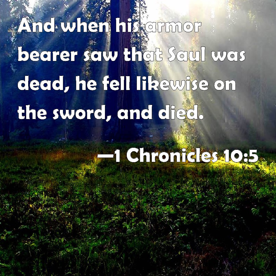 Choose a Background 1 Chronicles 10:5 And when his armor bearer saw that Saul was dead, he fell likewise on the sword, and died. KJV: And when his armourbearer saw that Saul was dead, he fell likewise on the sword, and died. DRB: And when his armourbearer saw it, to wit, that Saul was dead, he also fell upon his sword and died. DBT: And when his armour-bearer saw that Saul was dead, he fell likewise on the sword, and died. ERV: And when his armourbearer saw that Saul was dead, he likewise fell upon his sword, and died. WBT: And when his armor-bearer saw that Saul was dead, he fell likewise on the sword, and died. WEB: When his armor bearer saw that Saul was dead, he likewise fell on his sword, and died. YLT: and the bearer of his weapons seeth that Saul is dead, and falleth, he also, on the sword, and dieth;Links 1 Chronicles 10:5 NIV • 1 Chronicles 10:5 NLT • 1 Chronicles 10:5 ESV • 1 Chronicles 10:5 NASB • 1 Chronicles 10:5 KJV • 1 Chronicles 10:5 Interlinear • 1 Chronicles 10:5 Commentaries • 1 Chronicles 10:5 Parallel Texts • 1 Chronicles 10:5 Bible Apps • 1 Chronicles 10:5 Parallel • Bible Hub |