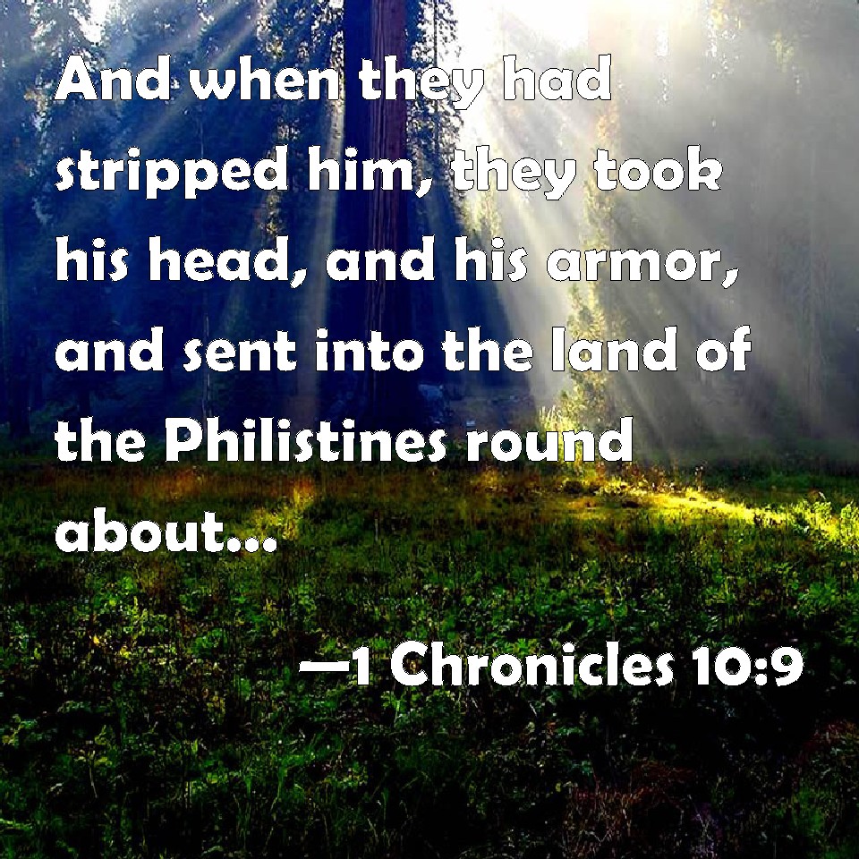 Choose a Background 1 Chronicles 10:9 And when they had stripped him, they took his head, and his armor, and sent into the land of the Philistines round about, to carry tidings to their idols, and to the people. KJV: And when they had stripped him, they took his head, and his armour, and sent into the land of the Philistines round about, to carry tidings unto their idols, and to the people. DRB: And when they had stripped him, and cut off his head, and taken away his armour, they sent it into their land, to be carried about, and shewn in the temples of the idols and to the people. DBT: And they stripped him, and took his head, and his armour, and sent them into the land of the Philistines round about, to announce the glad tidings to their idols, and to the people. ERV: And they stripped him, and took his head, and his armour, and sent into the land of the Philistines round about, to carry the tidings unto their idols, and to the people. WBT: And when they had stripped him, they took his head, and his armor, and sent into the land of the Philistines around, to carry tidings to their idols, and to the people. WEB: They stripped him, and took his head, and his armor, and sent into the land of the Philistines all around, to carry the news to their idols, and to the people. YLT: and strip him, and bear away his head, and his weapons, and send into the land of the Philistines round about to proclaim tidings to their idols and the people,Links 1 Chronicles 10:9 NIV • 1 Chronicles 10:9 NLT • 1 Chronicles 10:9 ESV • 1 Chronicles 10:9 NASB • 1 Chronicles 10:9 KJV • 1 Chronicles 10:9 Interlinear • 1 Chronicles 10:9 Commentaries • 1 Chronicles 10:9 Parallel Texts • 1 Chronicles 10:9 Bible Apps • 1 Chronicles 10:9 Parallel • Bible Hub |