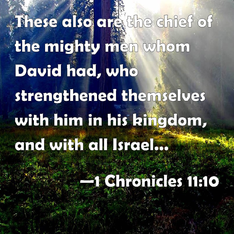 Choose a Background 1 Chronicles 11:10 These also are the chief of the mighty men whom David had, who strengthened themselves with him in his kingdom, and with all Israel, to make him king, according to the word of the LORD concerning Israel. KJV: These also are the chief of the mighty men whom David had, who strengthened themselves with him in his kingdom, and with all Israel, to make him king, according to the word of the LORD concerning Israel. DRB: These are the chief of the valiant men of David, who helped him to be made king over all Israel, according to the word of the Lord, which he spoke to Israel. DBT: And these are the chief of the mighty men whom David had, who shewed themselves valiant with him in his kingdom, with all Israel, to make him king, according to the word of Jehovah concerning Israel. ERV: Now these are the chief of the mighty men whom David had, who shewed themselves strong with him in his kingdom, together with all Israel, to make him king, according to the word of the LORD concerning Israel. WBT: These also are the chief of the mighty men whom David had, who strengthened themselves with him in his kingdom, and with all Israel, to make him king according to the word of the LORD concerning Israel. WEB: Now these are the chief of the mighty men whom David had, who showed themselves strong with him in his kingdom, together with all Israel, to make him king, according to the word of Yahweh concerning Israel. YLT: And these are heads of the mighty ones whom David hath, who are strengthening themselves with him in his kingdom, with all Israel, to cause him to reign, according to the word of Jehovah, over Israel.Links 1 Chronicles 11:10 NIV • 1 Chronicles 11:10 NLT • 1 Chronicles 11:10 ESV • 1 Chronicles 11:10 NASB • 1 Chronicles 11:10 KJV • 1 Chronicles 11:10 Interlinear • 1 Chronicles 11:10 Commentaries • 1 Chronicles 11:10 Parallel Texts • 1 Chronicles 11:10 Bible Apps • 1 Chronicles 11:10 Parallel • Bible Hub |