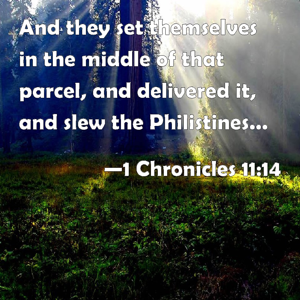 Choose a Background 1 Chronicles 11:14 And they set themselves in the middle of that parcel, and delivered it, and slew the Philistines; and the LORD saved them by a great deliverance. KJV: And they set themselves in the midst of that parcel, and delivered it, and slew the Philistines; and the LORD saved them by a great deliverance. DRB: But these men stood in the midst of the field, and defended it: and they slew the Philistines, and the Lord gave a great deliverance to his people. DBT: And they stood in the midst of the plot and delivered it, and smote the Philistines; and Jehovah wrought a great deliverance. ERV: And they stood in the midst of the plot, and defended it, and slew the Philistines; and the LORD saved them by a great victory. WBT: And they set themselves in the midst of that parcel, and delivered it, and slew the Philistines; and the LORD saved them by a great deliverance. WEB: They stood in the midst of the plot, and defended it, and killed the Philistines; and Yahweh saved them by a great victory. YLT: and they station themselves in the midst of the portion, and deliver it, and smite the Philistines, and Jehovah saveth — a great salvation.Links 1 Chronicles 11:14 NIV • 1 Chronicles 11:14 NLT • 1 Chronicles 11:14 ESV • 1 Chronicles 11:14 NASB • 1 Chronicles 11:14 KJV • 1 Chronicles 11:14 Interlinear • 1 Chronicles 11:14 Commentaries • 1 Chronicles 11:14 Parallel Texts • 1 Chronicles 11:14 Bible Apps • 1 Chronicles 11:14 Parallel • Bible Hub |