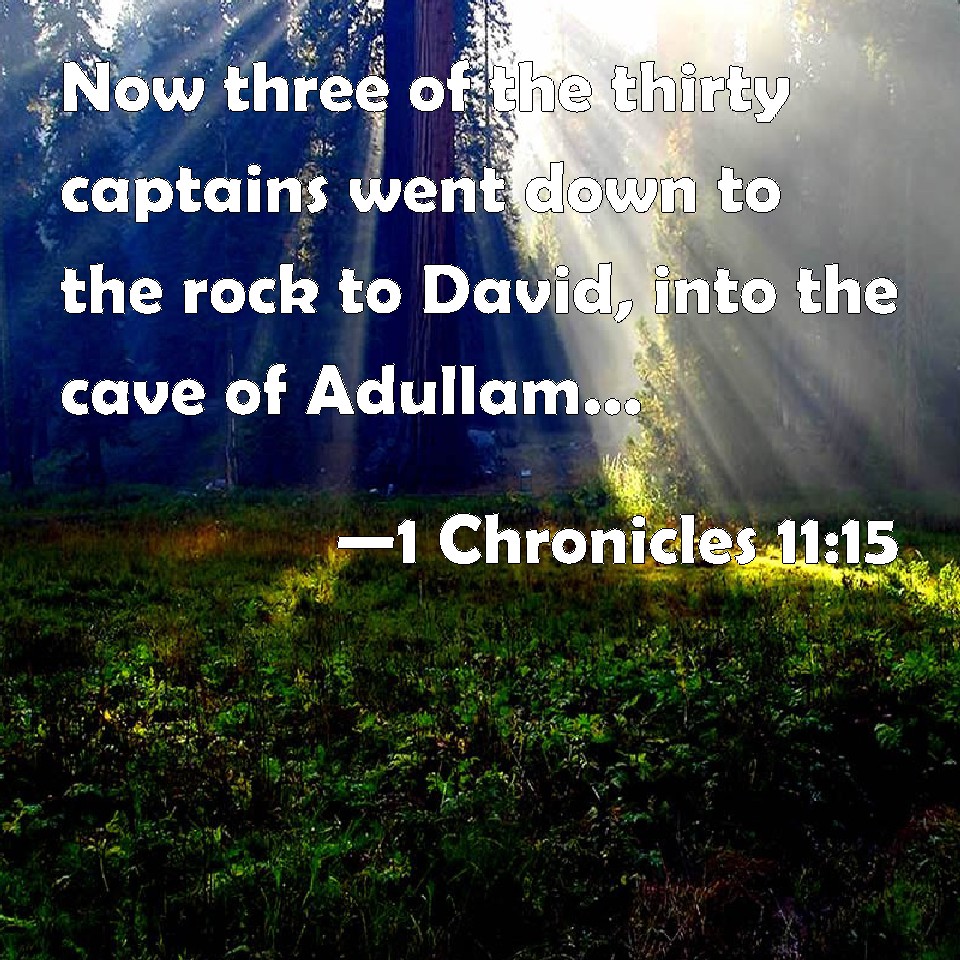 Choose a Background 1 Chronicles 11:15 Now three of the thirty captains went down to the rock to David, into the cave of Adullam; and the host of the Philistines encamped in the valley of Rephaim. KJV: Now three of the thirty captains went down to the rock to David, into the cave of Adullam; and the host of the Philistines encamped in the valley of Rephaim. DRB: And three of the thirty captains went down to the rock, wherein David was, to the cave of Odollam, when the Philistines encamped in the valley of Raphaim. DBT: And three of the thirty chiefs went down to the rock to David, to the cave of Adullam, when the army of the Philistines was encamped in the valley of Rephaim. ERV: And three of the thirty chief went down to the rock to David, into the cave of Adullam; and the host of the Philistines were encamped in the valley of Rephaim. WBT: Now three of the thirty captains went down to the rock to David, into the cave of Adullam; and the host of the Philistines encamped in the valley of Rephaim. WEB: Three of the thirty chief men went down to the rock to David, into the cave of Adullam; and the army of the Philistines were encamped in the valley of Rephaim. YLT: And three of the thirty heads go down on the rock unto David, unto the cave of Adullam, and the host of the Philistines is encamping in the valley of Rephaim,Links 1 Chronicles 11:15 NIV • 1 Chronicles 11:15 NLT • 1 Chronicles 11:15 ESV • 1 Chronicles 11:15 NASB • 1 Chronicles 11:15 KJV • 1 Chronicles 11:15 Interlinear • 1 Chronicles 11:15 Commentaries • 1 Chronicles 11:15 Parallel Texts • 1 Chronicles 11:15 Bible Apps • 1 Chronicles 11:15 Parallel • Bible Hub |