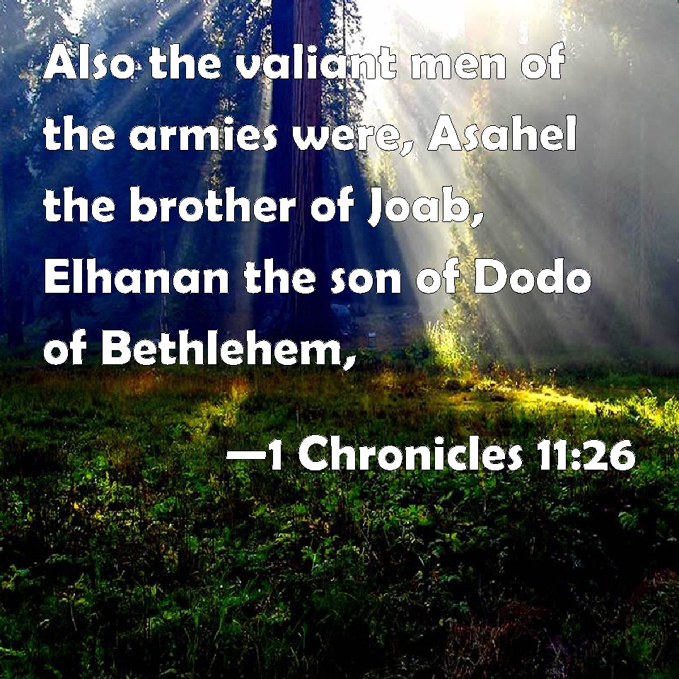 Choose a Background 1 Chronicles 11:26 Also the valiant men of the armies were, Asahel the brother of Joab, Elhanan the son of Dodo of Bethlehem, KJV: Also the valiant men of the armies were, Asahel the brother of Joab, Elhanan the son of Dodo of Bethlehem, DRB: Moreover the most valiant men of the army, were Asahel brother of Joab, and Elchanan the son of his uncle of Bethlehem, DBT: And the valiant men of the forces were: Asahel the brother of Joab, Elhanan the son of Dodo of Bethlehem, ERV: Also the mighty men of the armies; Asahel the brother of Joab, Elhanan the son of Dodo of Beth-lehem; WBT: Also the valiant men of the armies were, Asahel the brother of Joab, Elhanan the son of Dodo of Beth-lehem, WEB: Also the mighty men of the armies: Asahel the brother of Joab, Elhanan the son of Dodo of Bethlehem, YLT: And the mighty ones of the forces are Asahel brother of Joab, Elhanan son of Dodo of Beth-Lehem,Links 1 Chronicles 11:26 NIV • 1 Chronicles 11:26 NLT • 1 Chronicles 11:26 ESV • 1 Chronicles 11:26 NASB • 1 Chronicles 11:26 KJV • 1 Chronicles 11:26 Interlinear • 1 Chronicles 11:26 Commentaries • 1 Chronicles 11:26 Parallel Texts • 1 Chronicles 11:26 Bible Apps • 1 Chronicles 11:26 Parallel • Bible Hub |