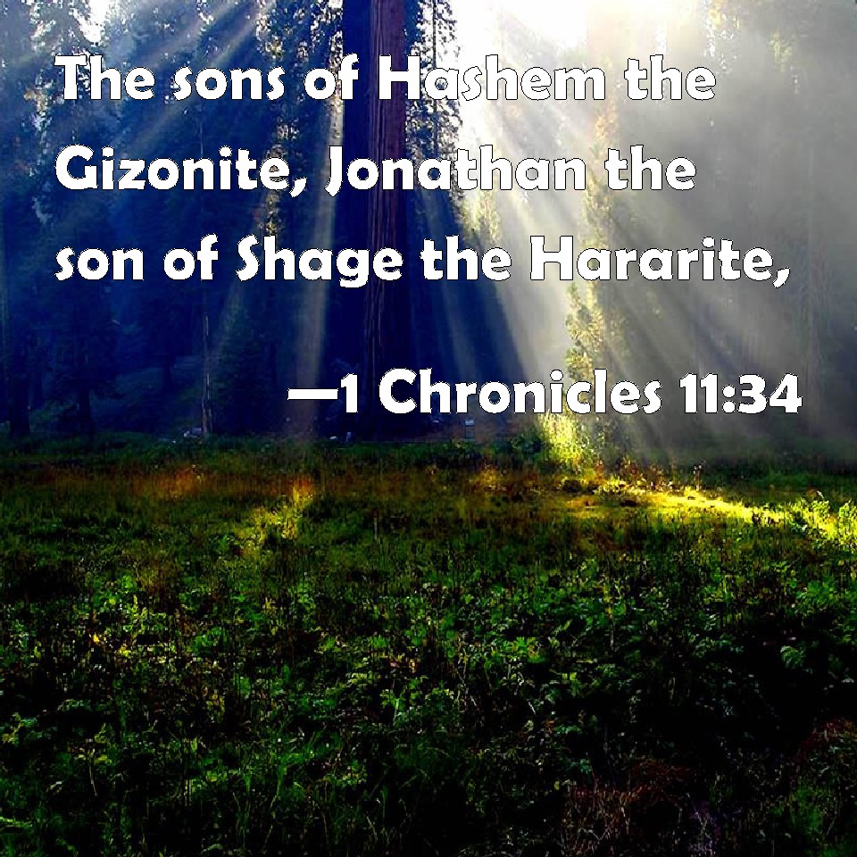 Choose a Background 1 Chronicles 11:34 The sons of Hashem the Gizonite, Jonathan the son of Shage the Hararite, KJV: The sons of Hashem the Gizonite, Jonathan the son of Shage the Hararite, DRB: Ahiam the son of Sachar an Ararite, DBT: Bene-Hashem the Gizonite, Jonathan the son of Shage the Hararite, ERV: the sons of Hashem the Gizonite, Jonathan the son of Shage the Hararite; WBT: The sons of Hashem the Gizonite, Jonathan the son of Shage the Hararite, WEB: the sons of Hashem the Gizonite, Jonathan the son of Shagee the Hararite, YLT: the sons of Hashem the Gizonite, Jonathan son of Shage the Hararite,Links 1 Chronicles 11:34 NIV • 1 Chronicles 11:34 NLT • 1 Chronicles 11:34 ESV • 1 Chronicles 11:34 NASB • 1 Chronicles 11:34 KJV • 1 Chronicles 11:34 Interlinear • 1 Chronicles 11:34 Commentaries • 1 Chronicles 11:34 Parallel Texts • 1 Chronicles 11:34 Bible Apps • 1 Chronicles 11:34 Parallel • Bible Hub |