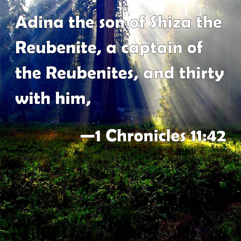 Choose a Background 1 Chronicles 11:42 Adina the son of Shiza the Reubenite, a captain of the Reubenites, and thirty with him, KJV: Adina the son of Shiza the Reubenite, a captain of the Reubenites, and thirty with him, DRB: Adina the son of Siza a Rubenite the prince of the Rubenites, and thirty with him: DBT: Adina the son of Shiza the Reubenite, a captain of the Reubenites, and thirty with him; ERV: Adina the son of Shiza the Reubenite, a chief of the Reubenites, and thirty with him; WBT: Adina the son of Shiza the Reubenite, a captain of the Reubenites, and thirty with him, WEB: Adina the son of Shiza the Reubenite, a chief of the Reubenites, and thirty with him, YLT: Adina son of Shiza the Reubenite, head of the Reubenites, and by him thirty,Links 1 Chronicles 11:42 NIV • 1 Chronicles 11:42 NLT • 1 Chronicles 11:42 ESV • 1 Chronicles 11:42 NASB • 1 Chronicles 11:42 KJV • 1 Chronicles 11:42 Interlinear • 1 Chronicles 11:42 Commentaries • 1 Chronicles 11:42 Parallel Texts • 1 Chronicles 11:42 Bible Apps • 1 Chronicles 11:42 Parallel • Bible Hub |