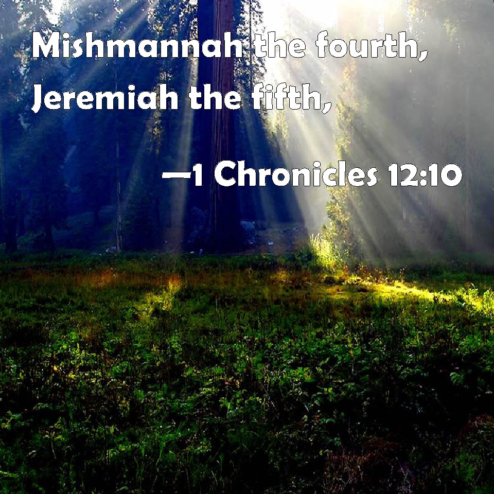 Choose a Background 1 Chronicles 12:10 Mishmannah the fourth, Jeremiah the fifth, KJV: Mishmannah the fourth, Jeremiah the fifth, DRB: Masmana the fourth, Jeremias the fifth. DBT: Mishmannah the fourth, Jeremiah the fifth, ERV: Mishmannah the fourth; Jeremiah the fifth; WBT: Mishmannah the fourth, Jeremiah the fifth, WEB: Mishmannah the fourth, Jeremiah the fifth, YLT: Mishmannah the fourth, Jeremiah the fifth,Links 1 Chronicles 12:10 NIV • 1 Chronicles 12:10 NLT • 1 Chronicles 12:10 ESV • 1 Chronicles 12:10 NASB • 1 Chronicles 12:10 KJV • 1 Chronicles 12:10 Interlinear • 1 Chronicles 12:10 Commentaries • 1 Chronicles 12:10 Parallel Texts • 1 Chronicles 12:10 Bible Apps • 1 Chronicles 12:10 Parallel • Bible Hub |