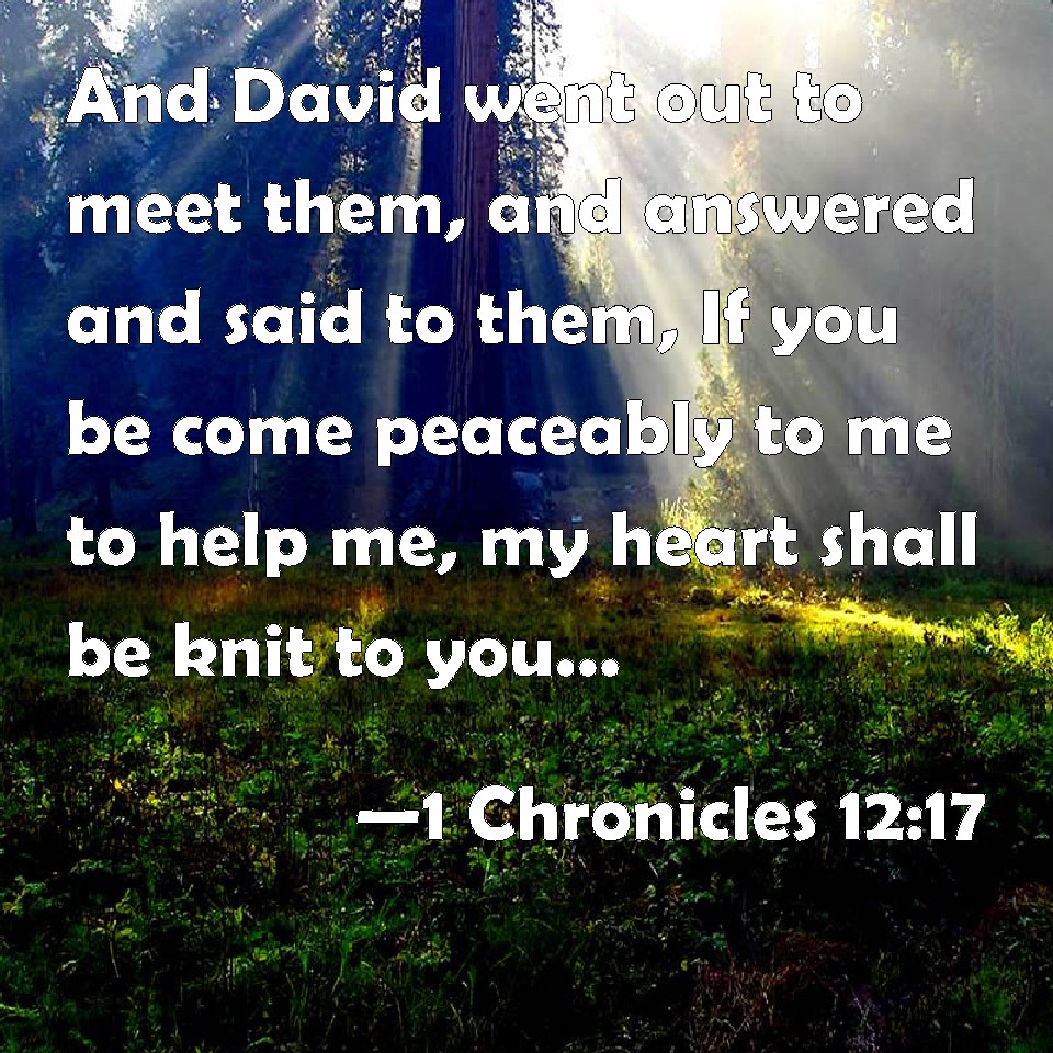 Choose a Background 1 Chronicles 12:17 And David went out to meet them, and answered and said to them, If you be come peaceably to me to help me, my heart shall be knit to you: but if you be come to betray me to my enemies, seeing there is no wrong in my hands, the God of our fathers look thereon, and rebuke it. KJV: And David went out to meet them, and answered and said unto them, If ye be come peaceably unto me to help me, mine heart shall be knit unto you: but if ye be come to betray me to mine enemies, seeing there is no wrong in mine hands, the God of our fathers look thereon, and rebuke it. DRB: And David went out to meet them, and said: If you are come peaceably to me to help me, let my heart be joined to you: but if you plot against me for my enemies whereas I have no iniquity in my hands, let the God of our fathers see, and judge. DBT: And David went out to meet them, and answered and said to them, If ye come peaceably to me to help me, my heart shall be knit unto you; but if to betray me to mine enemies, seeing there is no wrong in my hands, the God of our fathers see it and rebuke it. ERV: And David went out to meet them, and answered and said unto them, If ye be come peaceably unto me to help me, mine heart shall be knit unto you: but if ye be come to betray me to mine adversaries, seeing there is no wrong in mine hands, the God of our fathers look thereon, and rebuke it. WBT: And David went out to meet them, and answered and said to them, If ye have come peaceably to me to help me, my heart shall be knit to you: but if ye have come to betray me to my enemies, seeing there is no wrong in my hands, the God of our fathers look on it, and rebuke it. WEB: David went out to meet them, and answered them, "If you have come peaceably to me to help me, my heart shall be knit to you; but if you have come to betray me to my adversaries, since there is no wrong in my hands, may the God of our fathers look thereon, and rebuke it." YLT: and David goeth out before them, and answereth and saith to them, 'If for peace ye have come in unto me, to help me, I have a heart to unite with you; and if to betray me to mine adversaries — without violence in my hands — the God of our fathers doth see and reprove.'Links 1 Chronicles 12:17 NIV • 1 Chronicles 12:17 NLT • 1 Chronicles 12:17 ESV • 1 Chronicles 12:17 NASB • 1 Chronicles 12:17 KJV • 1 Chronicles 12:17 Interlinear • 1 Chronicles 12:17 Commentaries • 1 Chronicles 12:17 Parallel Texts • 1 Chronicles 12:17 Bible Apps • 1 Chronicles 12:17 Parallel • Bible Hub |