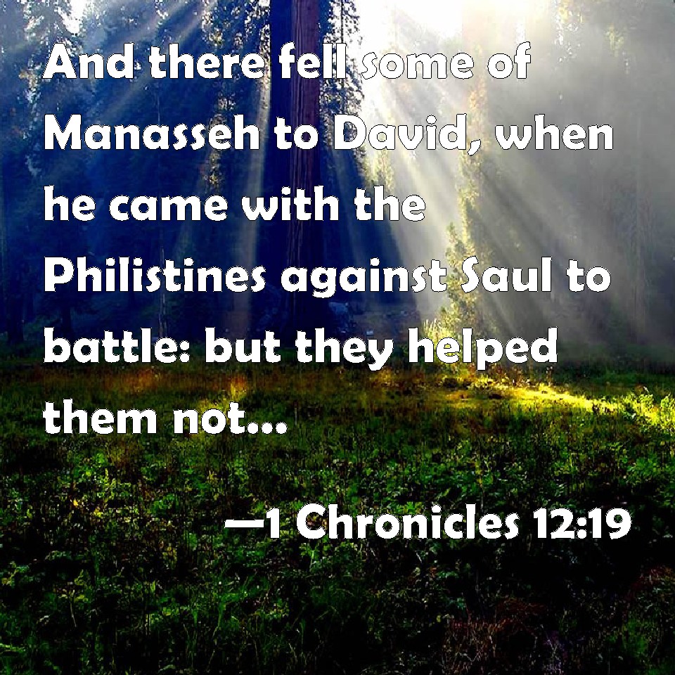 Choose a Background 1 Chronicles 12:19 And there fell some of Manasseh to David, when he came with the Philistines against Saul to battle: but they helped them not: for the lords of the Philistines on advisement sent him away, saying, He will fall to his master Saul to the jeopardy of our heads. KJV: And there fell some of Manasseh to David, when he came with the Philistines against Saul to battle: but they helped them not: for the lords of the Philistines upon advisement sent him away, saying, He will fall to his master Saul to the jeopardy of our heads. DRB: And there were some of Manasses that went over to David, when he came with the Philistines against Saul to fight: but he did not fight with them: because the lords of the Philistines taking counsel sent him back, saying: With the danger of our heads he will return to his master Saul. DBT: And there fell some of Manasseh to David, when he came with the Philistines against Saul to battle: but they helped them not; for the lords of the Philistines upon deliberation sent him away, saying, He will fall to his master Saul at the peril of our heads. ERV: Of Manasseh also there fell away some to David, when he came with the Philistines against Saul to battle, but they helped them not: for the lords of the Philistines upon advisement sent him away, saying, He will fall away to his master Saul to the jeopardy of our heads. WBT: And there fell some of Manasseh to David, when he came with the Philistines against Saul to battle: but they helped them not: for the lords of the Philistines upon advisement sent him away, saying, He will fall to his master Saul to the jeopardy of our heads. WEB: Of Manasseh also there fell away some to David, when he came with the Philistines against Saul to battle; but they didn't help them; for the lords of the Philistines sent him away after consultation, saying, "He will fall away to his master Saul to the jeopardy of our heads." YLT: And of Manasseh there have fallen unto David in his coming with the Philistines against Israel to battle — and they helped them not, for by counsel the princes of the Philistines sent him away, saying, 'With our heads he doth fall unto his master Saul.' — Links 1 Chronicles 12:19 NIV • 1 Chronicles 12:19 NLT • 1 Chronicles 12:19 ESV • 1 Chronicles 12:19 NASB • 1 Chronicles 12:19 KJV • 1 Chronicles 12:19 Interlinear • 1 Chronicles 12:19 Commentaries • 1 Chronicles 12:19 Parallel Texts • 1 Chronicles 12:19 Bible Apps • 1 Chronicles 12:19 Parallel • Bible Hub |