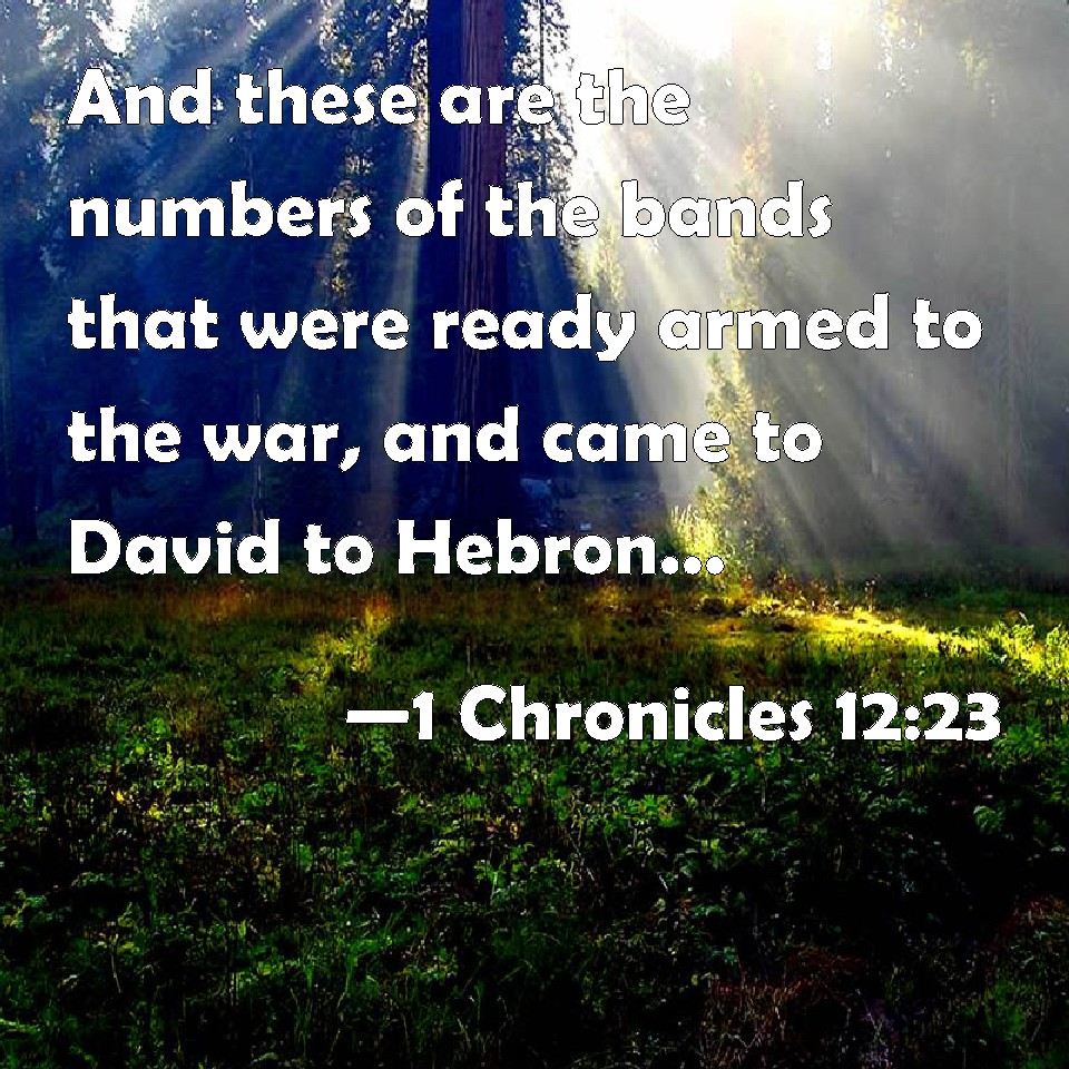 Choose a Background 1 Chronicles 12:23 And these are the numbers of the bands that were ready armed to the war, and came to David to Hebron, to turn the kingdom of Saul to him, according to the word of the LORD. KJV: And these are the numbers of the bands that were ready armed to the war, and came to David to Hebron, to turn the kingdom of Saul to him, according to the word of the LORD. DRB: And this is the number of the chiefs of the army who came to David, when he was in Hebron, to transfer to him the kingdom of Saul, according to the word of the Lord. DBT: And this is the number of the men equipped for military service, who came to David to Hebron, to transfer the kingdom of Saul to him, according to the word of Jehovah. ERV: And these are the numbers of the heads of them that were armed for war, which came to David to Hebron, to turn the kingdom of Saul to him, according to the word of the LORD. WBT: And these are the numbers of the bands that were ready armed to the war, and came to David to Hebron, to turn the kingdom of Saul to him, according to the word of the LORD. WEB: These are the numbers of the heads of those who were armed for war, who came to David to Hebron, to turn the kingdom of Saul to him, according to the word of Yahweh. YLT: And these are the numbers of the head, of the armed men of the host; they have come in unto David to Hebron to turn round the kingdom of Saul unto him, according to the mouth of Jehovah.Links 1 Chronicles 12:23 NIV • 1 Chronicles 12:23 NLT • 1 Chronicles 12:23 ESV • 1 Chronicles 12:23 NASB • 1 Chronicles 12:23 KJV • 1 Chronicles 12:23 Interlinear • 1 Chronicles 12:23 Commentaries • 1 Chronicles 12:23 Parallel Texts • 1 Chronicles 12:23 Bible Apps • 1 Chronicles 12:23 Parallel • Bible Hub |