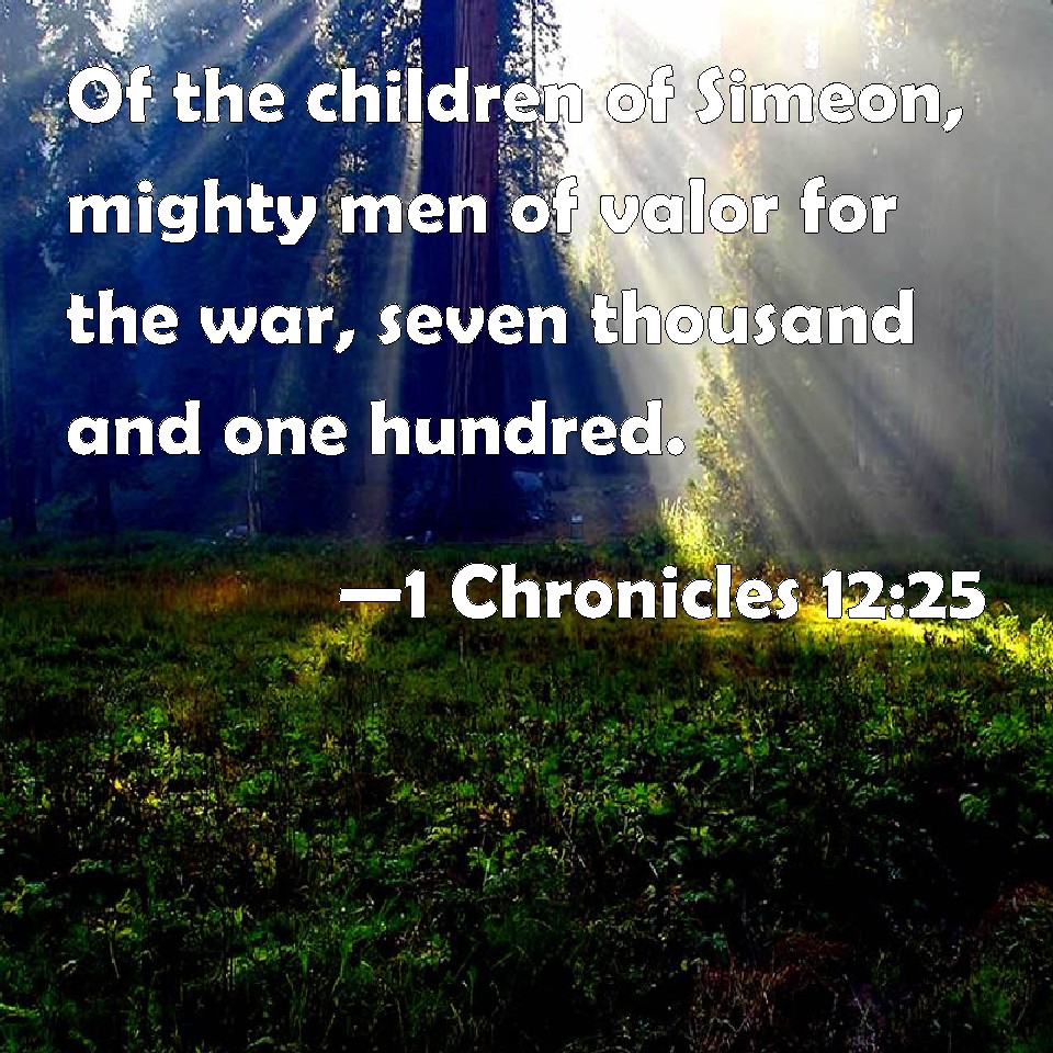 Choose a Background 1 Chronicles 12:25 Of the children of Simeon, mighty men of valor for the war, seven thousand and one hundred. KJV: Of the children of Simeon, mighty men of valour for the war, seven thousand and one hundred. DRB: Of the sons of Simeon valiant men for war, seven thousand one hundred. DBT: Of the children of Simeon, mighty men of valour for war, seven thousand one hundred. ERV: Of the children of Simeon, mighty men of valour for the war, seven thousand and one hundred. WBT: Of the children of Simeon, mighty men of valor for war, seven thousand and one hundred. WEB: Of the children of Simeon, mighty men of valor for the war, seven thousand and one hundred. YLT: Of the sons of Simeon, mighty ones of valour for the host, are seven thousand and a hundred.Links 1 Chronicles 12:25 NIV • 1 Chronicles 12:25 NLT • 1 Chronicles 12:25 ESV • 1 Chronicles 12:25 NASB • 1 Chronicles 12:25 KJV • 1 Chronicles 12:25 Interlinear • 1 Chronicles 12:25 Commentaries • 1 Chronicles 12:25 Parallel Texts • 1 Chronicles 12:25 Bible Apps • 1 Chronicles 12:25 Parallel • Bible Hub |