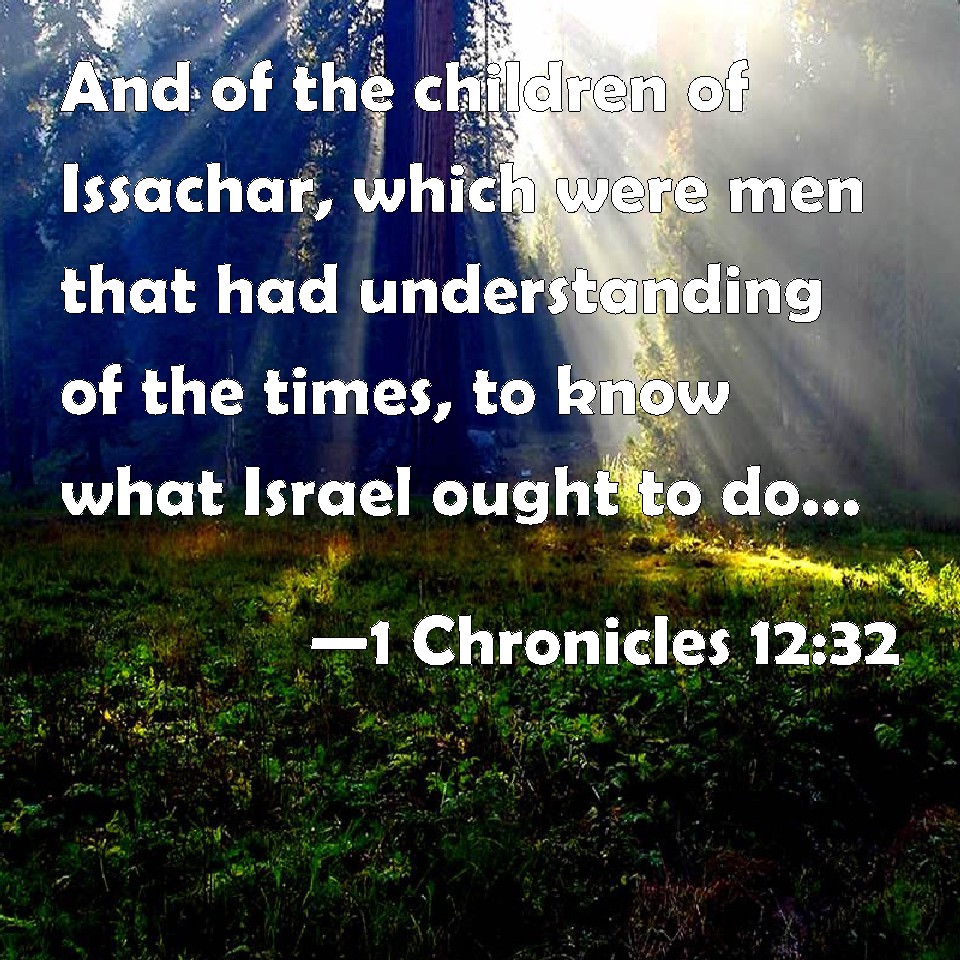 Choose a Background 1 Chronicles 12:32 And of the children of Issachar, which were men that had understanding of the times, to know what Israel ought to do; the heads of them were two hundred; and all their brothers were at their commandment. KJV: And of the children of Issachar, which were men that had understanding of the times, to know what Israel ought to do; the heads of them were two hundred; and all their brethren were at their commandment. DRB: Also of the sons of Issachar men of understanding, that knew all times to order what Israel should do, two hundred principal men: and all the rest of the tribe followed their counsel. DBT: And of the children of Issachar, who had understanding of the times, to know what Israel ought to do, the heads of them were two hundred; and all their brethren were at their bidding. ERV: And of the children of Issachar, men that had understanding of the times, to know what Israel ought to do; the heads of them were two hundred; and all their brethren were at their commandment. WBT: And of the children of Issachar, who were men that had understanding of the times, to know what Israel ought to do; the heads of them were two hundred; and all their brethren were at their command. WEB: Of the children of Issachar, men who had understanding of the times, to know what Israel ought to do, the heads of them were two hundred; and all their brothers were at their commandment. YLT: And of the sons of Issachar, having understanding for the times, to know what Israel should do; their heads are two hundred, and all their brethren are at their command.Links 1 Chronicles 12:32 NIV • 1 Chronicles 12:32 NLT • 1 Chronicles 12:32 ESV • 1 Chronicles 12:32 NASB • 1 Chronicles 12:32 KJV • 1 Chronicles 12:32 Interlinear • 1 Chronicles 12:32 Commentaries • 1 Chronicles 12:32 Parallel Texts • 1 Chronicles 12:32 Bible Apps • 1 Chronicles 12:32 Parallel • Bible Hub |