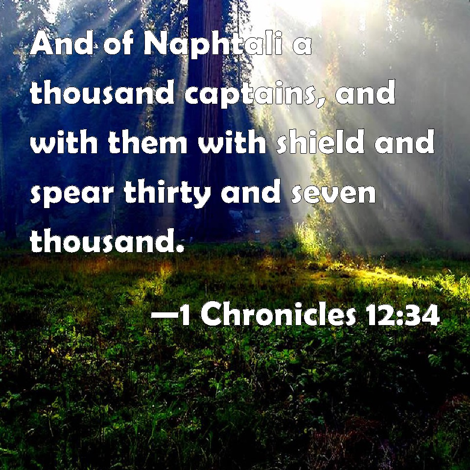 Choose a Background 1 Chronicles 12:34 And of Naphtali a thousand captains, and with them with shield and spear thirty and seven thousand. KJV: And of Naphtali a thousand captains, and with them with shield and spear thirty and seven thousand. DRB: And of Nephtali, a thousand leaders: and with them seven and thirty thousand, furnished with shield and spear. DBT: And of Naphtali a thousand captains, and with them thirty-seven thousand with shield and spear. ERV: And of Naphtali a thousand captains, and with them with shield and spear thirty and seven thousand. WBT: And of Naphtali a thousand captains, and with them with shield and spear thirty and seven thousand. WEB: Of Naphtali one thousand captains, and with them with shield and spear thirty-seven thousand. YLT: And of Naphtali, a thousand heads, and with them, with target and spear, are thirty and seven thousand.Links 1 Chronicles 12:34 NIV • 1 Chronicles 12:34 NLT • 1 Chronicles 12:34 ESV • 1 Chronicles 12:34 NASB • 1 Chronicles 12:34 KJV • 1 Chronicles 12:34 Interlinear • 1 Chronicles 12:34 Commentaries • 1 Chronicles 12:34 Parallel Texts • 1 Chronicles 12:34 Bible Apps • 1 Chronicles 12:34 Parallel • Bible Hub |