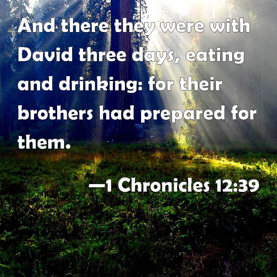 Choose a Background 1 Chronicles 12:39 And there they were with David three days, eating and drinking: for their brothers had prepared for them. KJV: And there they were with David three days, eating and drinking: for their brethren had prepared for them. DRB: And they were there with David three days eating and drinking: for their brethren had prepared for them. DBT: And there they were with David three days, eating and drinking; for their brethren had prepared for them; ERV: And they were there with David three days, eating and drinking: for their brethren had made preparation for them. WBT: And there they were with David three days, eating and drinking: for their brethren had prepared for them. WEB: They were there with David three days, eating and drinking; for their brothers had made preparation for them. YLT: and they are there, with David, three days, eating and drinking, for their brethren have prepared for them.Links 1 Chronicles 12:39 NIV • 1 Chronicles 12:39 NLT • 1 Chronicles 12:39 ESV • 1 Chronicles 12:39 NASB • 1 Chronicles 12:39 KJV • 1 Chronicles 12:39 Interlinear • 1 Chronicles 12:39 Commentaries • 1 Chronicles 12:39 Parallel Texts • 1 Chronicles 12:39 Bible Apps • 1 Chronicles 12:39 Parallel • Bible Hub |