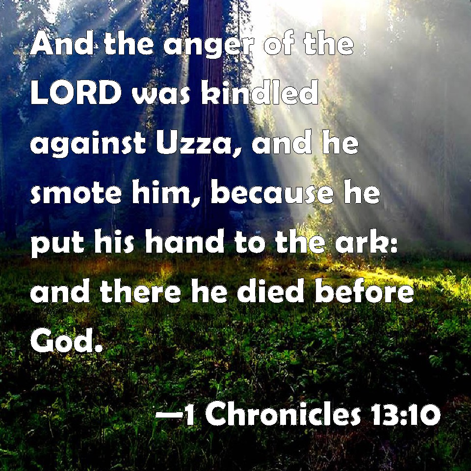 Choose a Background 1 Chronicles 13:10 And the anger of the LORD was kindled against Uzza, and he smote him, because he put his hand to the ark: and there he died before God. KJV: And the anger of the LORD was kindled against Uzza, and he smote him, because he put his hand to the ark: and there he died before God. DRB: And the Lord was angry with Oza, and struck him, because he had touched the ark; and he died there before the Lord. DBT: And the anger of Jehovah was kindled against Uzza, and he smote him, because he had put forth his hand to the ark; and there he died before God. ERV: And the anger of the LORD was kindled against Uzza, and he smote him, because he put forth his hand to the ark: and there he died before God. WBT: And the anger of the LORD was kindled against Uzza, and he smote him, because he put his hand to the ark: and there he died before God. WEB: The anger of Yahweh was kindled against Uzza, and he struck him, because he put forth his hand to the ark; and there he died before God. YLT: and the anger of Jehovah is kindled against Uzza, and He smiteth him, because that he hath put forth his hand on the ark, and he dieth there before God.Links 1 Chronicles 13:10 NIV • 1 Chronicles 13:10 NLT • 1 Chronicles 13:10 ESV • 1 Chronicles 13:10 NASB • 1 Chronicles 13:10 KJV • 1 Chronicles 13:10 Interlinear • 1 Chronicles 13:10 Commentaries • 1 Chronicles 13:10 Parallel Texts • 1 Chronicles 13:10 Bible Apps • 1 Chronicles 13:10 Parallel • Bible Hub |