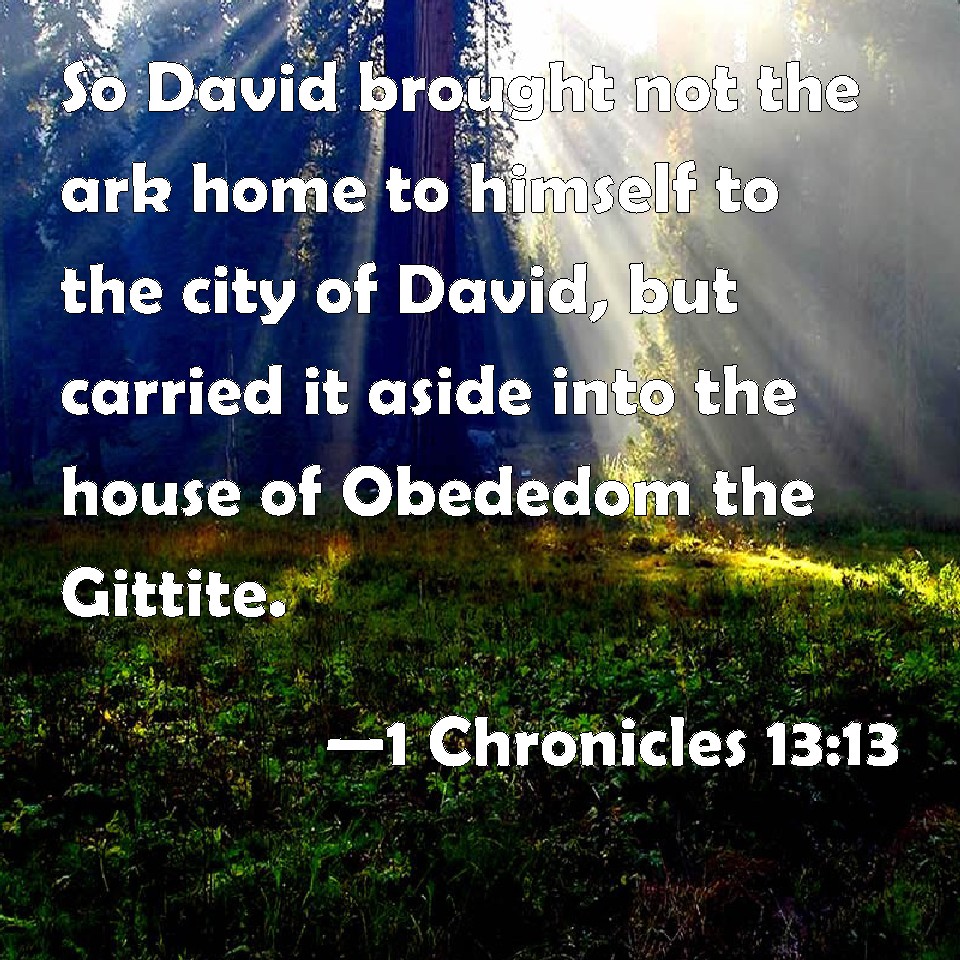 Choose a Background 1 Chronicles 13:13 So David brought not the ark home to himself to the city of David, but carried it aside into the house of Obededom the Gittite. KJV: So David brought not the ark home to himself to the city of David, but carried it aside into the house of Obededom the Gittite. DRB: And therefore he brought it not home to himself, that is, into the city of David, but carried it aside into the house of Obededom the Gethite. DBT: And David brought not the ark home unto himself into the city of David, but he carried it aside into the house of Obed-Edom the Gittite. ERV: So David removed not the ark unto him into the city of David, but carried it aside into the house of Obed-edom the Gittite. WBT: So David brought not the ark to himself to the city of David, but carried it aside into the house of Obed-edom the Gittite. WEB: So David didn't move the ark to him into the city of David, but carried it aside into the house of Obed-Edom the Gittite. YLT: And David hath not turned aside the ark unto himself, unto the city of David, and turneth it aside unto the house of Obed-Edom the Gittite.Links 1 Chronicles 13:13 NIV • 1 Chronicles 13:13 NLT • 1 Chronicles 13:13 ESV • 1 Chronicles 13:13 NASB • 1 Chronicles 13:13 KJV • 1 Chronicles 13:13 Interlinear • 1 Chronicles 13:13 Commentaries • 1 Chronicles 13:13 Parallel Texts • 1 Chronicles 13:13 Bible Apps • 1 Chronicles 13:13 Parallel • Bible Hub |