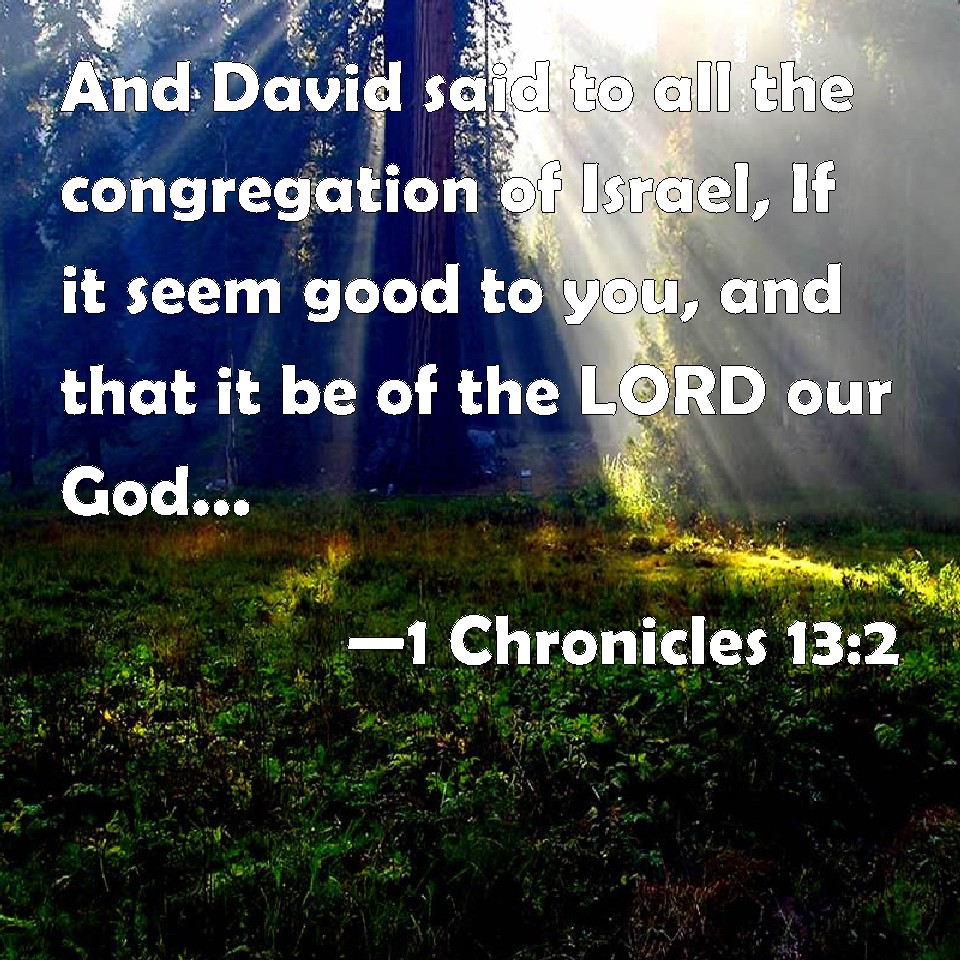 Choose a Background 1 Chronicles 13:2 And David said to all the congregation of Israel, If it seem good to you, and that it be of the LORD our God, let us send abroad to our brothers every where, that are left in all the land of Israel, and with them also to the priests and Levites which are in their cities and suburbs, that they may gather themselves to us: KJV: And David said unto all the congregation of Israel, If it seem good unto you, and that it be of the LORD our God, let us send abroad unto our brethren every where, that are left in all the land of Israel, and with them also to the priests and Levites which are in their cities and suburbs, that they may gather themselves unto us: DRB: And he said to all the assembly of Israel: If it please you; and if the words which I speak come from the Lord our God, let us send to the rest of our brethren into all the countries of Israel, and to the priests, and the Levites, that dwell in the suburbs of the cities, to gather themselves to us, DBT: And David said to all the congregation of Israel, If it seem good to you, and it be of Jehovah our God, let us send abroad to our brethren everywhere, that are left in all the lands of Israel, and with them to the priests and Levites in their cities and suburbs, that they may gather themselves to us; ERV: And David said unto, all the assembly of Israel, If it seem good unto you, and if it be of the LORD our God, let us send abroad every where unto our brethren that are left in all the land of Israel, with whom the priests and Levites are in their cities that have suburbs, that they may gather themselves unto us: WBT: And David said to all the congregation of Israel, If it seemeth good to you, and that it is of the LORD our God, let us send abroad to our brethren every where, that are left in all the land of Israel, and with them also to the priests and Levites who are in their cities and suburbs, that they may assemble to us: WEB: David said to all the assembly of Israel, "If it seems good to you, and if it is of Yahweh our God, let us send abroad everywhere to our brothers who are left in all the land of Israel, with whom the priests and Levites are in their cities that have suburbs, that they may gather themselves to us; YLT: and David saith to all the assembly of Israel, 'If unto you it be good, and from Jehovah our God it hath broken forth — we send unto our brethren, those left in all the lands of Israel, and with them the priests and the Levites, in the cities of their suburbs, and they are gathered unto us,Links 1 Chronicles 13:2 NIV • 1 Chronicles 13:2 NLT • 1 Chronicles 13:2 ESV • 1 Chronicles 13:2 NASB • 1 Chronicles 13:2 KJV • 1 Chronicles 13:2 Interlinear • 1 Chronicles 13:2 Commentaries • 1 Chronicles 13:2 Parallel Texts • 1 Chronicles 13:2 Bible Apps • 1 Chronicles 13:2 Parallel • Bible Hub |