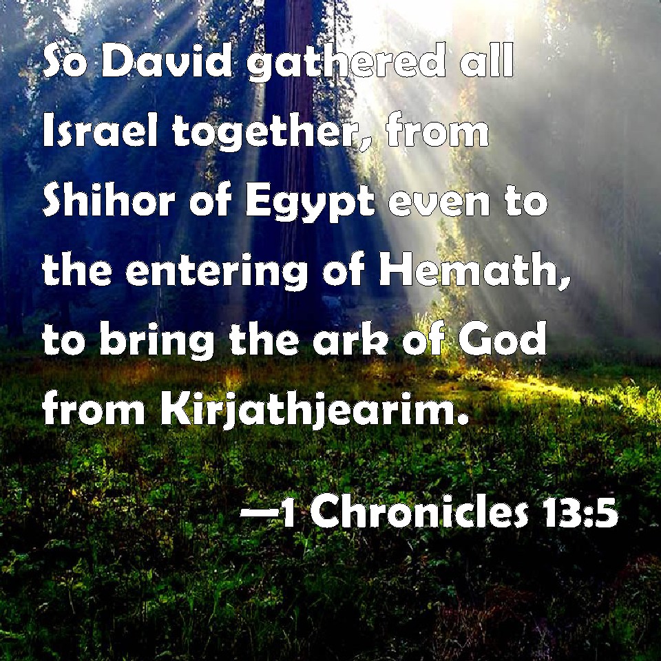 Choose a Background 1 Chronicles 13:5 So David gathered all Israel together, from Shihor of Egypt even to the entering of Hemath, to bring the ark of God from Kirjathjearim. KJV: So David gathered all Israel together, from Shihor of Egypt even unto the entering of Hemath, to bring the ark of God from Kirjathjearim. DRB: So David assembled all Israel from Sihor of Egypt, even to the entering into Emath, to bring the ark of God from Cariathiarim. DBT: And David assembled all Israel from the Shihor of Egypt unto the entrance of Hamath, to bring the ark of God from Kirjath-jearim. ERV: So David assembled all Israel together, from Shihor the brook of Egypt even unto the entering in of Hamath; to bring the ark of God from Kiriath-jearim. WBT: So David assembled all Israel, from Shihor of Egypt even to the entrance of Hemath, to bring the ark of God from Kirjath-jearim. WEB: So David assembled all Israel together, from the Shihor [the brook] of Egypt even to the entrance of Hamath, to bring the ark of God from Kiriath Jearim. YLT: And David assembleth all Israel from Shihor of Egypt even unto the entering in of Hamath, to bring in the ark of God from Kirjath-Jearim,Links 1 Chronicles 13:5 NIV • 1 Chronicles 13:5 NLT • 1 Chronicles 13:5 ESV • 1 Chronicles 13:5 NASB • 1 Chronicles 13:5 KJV • 1 Chronicles 13:5 Interlinear • 1 Chronicles 13:5 Commentaries • 1 Chronicles 13:5 Parallel Texts • 1 Chronicles 13:5 Bible Apps • 1 Chronicles 13:5 Parallel • Bible Hub |