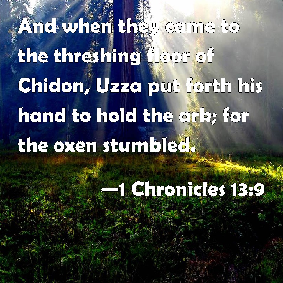 Choose a Background 1 Chronicles 13:9 And when they came to the threshing floor of Chidon, Uzza put forth his hand to hold the ark; for the oxen stumbled. KJV: And when they came unto the threshingfloor of Chidon, Uzza put forth his hand to hold the ark; for the oxen stumbled. DRB: And when they came to the floor of Chidon, Oza put forth his hand, to hold up the ark: for the ox being wanton had made it lean a little on one side. DBT: And when they came to the threshing-floor of Chidon, Uzza put forth his hand to hold the ark; for the oxen had stumbled. ERV: And when they came unto the threshing-floor of Chidon, Uzza put forth his hand to hold the ark; for the oxen stumbled. WBT: And when they came to the threshing-floor of Chidon, Uzza put forth his hand to hold the ark; for the oxen stumbled. WEB: When they came to the threshing floor of Chidon, Uzza put forth his hand to hold the ark; for the oxen stumbled. YLT: And they come in unto the threshing-floor of Chidon, and Uzza putteth forth his hand to seize the ark, for the oxen were released,Links 1 Chronicles 13:9 NIV • 1 Chronicles 13:9 NLT • 1 Chronicles 13:9 ESV • 1 Chronicles 13:9 NASB • 1 Chronicles 13:9 KJV • 1 Chronicles 13:9 Interlinear • 1 Chronicles 13:9 Commentaries • 1 Chronicles 13:9 Parallel Texts • 1 Chronicles 13:9 Bible Apps • 1 Chronicles 13:9 Parallel • Bible Hub |