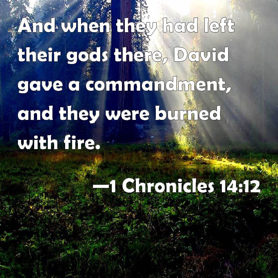 Choose a Background 1 Chronicles 14:12 And when they had left their gods there, David gave a commandment, and they were burned with fire. KJV: And when they had left their gods there, David gave a commandment, and they were burned with fire. DRB: And they left there their gods, and David commanded that they should be burnt. DBT: And they left their gods there; and David commanded, and they were burned with fire. ERV: And they left their gods there; and David gave commandment, and they were burned with fire. WBT: And when they had left their gods there, David gave a commandment, and they were burned with fire. WEB: They left their gods there; and David gave commandment, and they were burned with fire. YLT: And they leave there their gods, and David speaketh, and they are burnt with fire.Links 1 Chronicles 14:12 NIV • 1 Chronicles 14:12 NLT • 1 Chronicles 14:12 ESV • 1 Chronicles 14:12 NASB • 1 Chronicles 14:12 KJV • 1 Chronicles 14:12 Interlinear • 1 Chronicles 14:12 Commentaries • 1 Chronicles 14:12 Parallel Texts • 1 Chronicles 14:12 Bible Apps • 1 Chronicles 14:12 Parallel • Bible Hub |