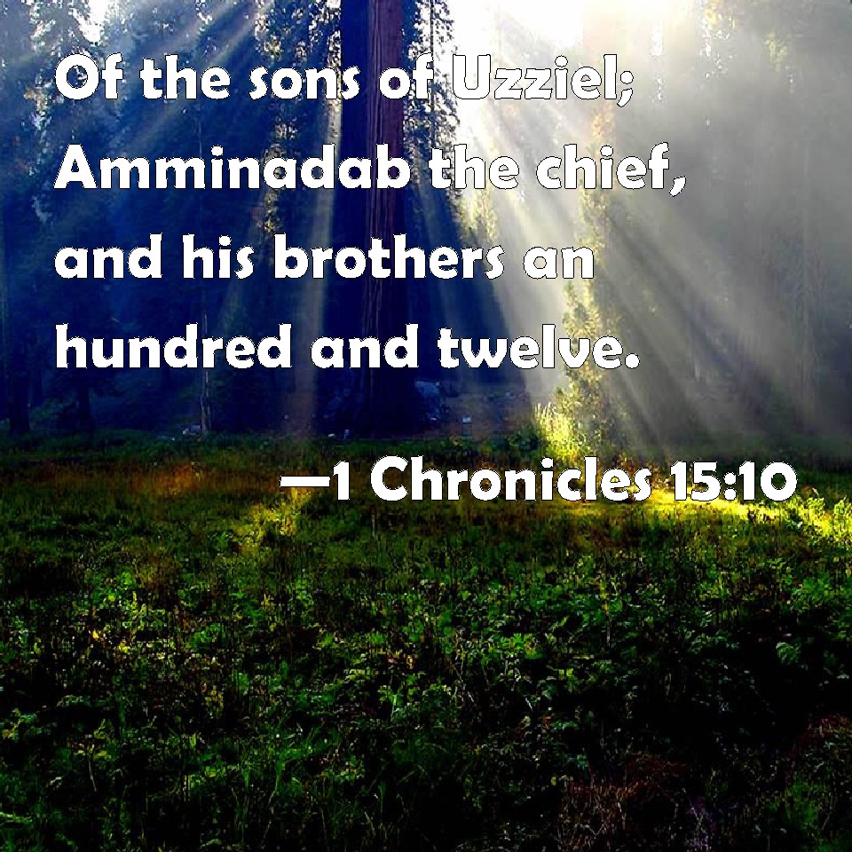 Choose a Background 1 Chronicles 15:10 Of the sons of Uzziel; Amminadab the chief, and his brothers an hundred and twelve. KJV: Of the sons of Uzziel; Amminadab the chief, and his brethren an hundred and twelve. DRB: Of the sons of Oziel, Aminadab the chief: and his brethren a hundred and twelve. DBT: of the sons of Uzziel, Amminadab the chief, and his brethren a hundred and twelve. ERV: of the sons of Uzziel; Amminadab the chief, and his brethren an hundred and twelve. WBT: Of the sons of Uzziel: Amminadab the chief, and his brethren a hundred and twelve. WEB: of the sons of Uzziel, Amminadab the chief, and his brothers one hundred twelve. YLT: Of sons of Uzziel: Amminadab the chief, and his brethren, a hundred and twelve.Links 1 Chronicles 15:10 NIV • 1 Chronicles 15:10 NLT • 1 Chronicles 15:10 ESV • 1 Chronicles 15:10 NASB • 1 Chronicles 15:10 KJV • 1 Chronicles 15:10 Interlinear • 1 Chronicles 15:10 Commentaries • 1 Chronicles 15:10 Parallel Texts • 1 Chronicles 15:10 Bible Apps • 1 Chronicles 15:10 Parallel • Bible Hub |