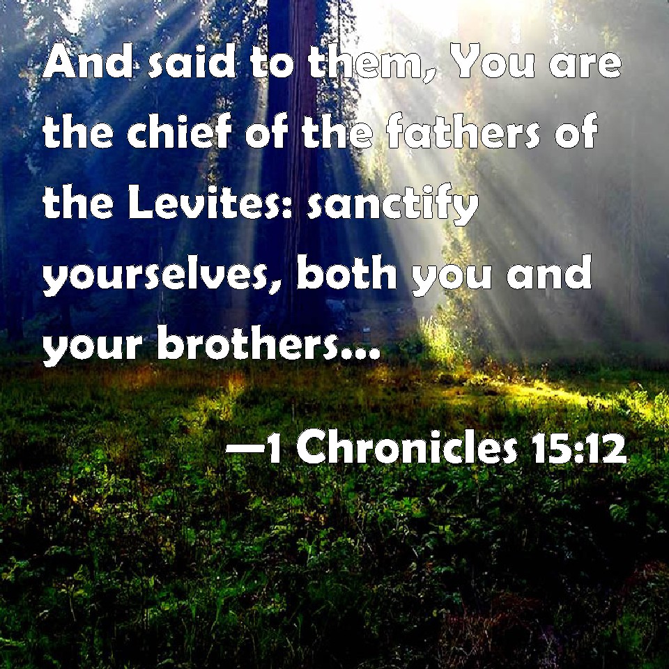 Choose a Background 1 Chronicles 15:12 And said to them, You are the chief of the fathers of the Levites: sanctify yourselves, both you and your brothers, that you may bring up the ark of the LORD God of Israel to the place that I have prepared for it. KJV: And said unto them, Ye are the chief of the fathers of the Levites: sanctify yourselves, both ye and your brethren, that ye may bring up the ark of the LORD God of Israel unto the place that I have prepared for it. DRB: And he said to them: You that are the heads of the Levitical families, be sanctified with your brethren, and brine the ark of the Lord the God of Israel to the place, which is prepared for it: DBT: and he said to them, Ye are the chief fathers of the Levites; hallow yourselves, ye and your brethren, that ye may bring up the ark of Jehovah the God of Israel to the place that I have prepared for it. ERV: and said unto them, Ye are the heads of the fathers' houses of the Levites: sanctify yourselves, both ye and your brethren, that ye may bring up the ark of the LORD, the God of Israel, unto the place that I have prepared for it. WBT: And said to them, Ye are the chief of the fathers of the Levites: sanctify yourselves, both ye and your brethren, that ye may bring up the ark of the LORD God of Israel to the place that I have prepared for it. WEB: and said to them, "You are the heads of the fathers' [houses] of the Levites. Sanctify yourselves, both you and your brothers, that you may bring up the ark of Yahweh, the God of Israel, to the place that I have prepared for it. YLT: and saith to them, 'Ye are heads of the fathers of the Levites; sanctify yourselves, ye and your brethren, and ye have brought up the ark of Jehovah, God of Israel, unto the place I have prepared for it;Links 1 Chronicles 15:12 NIV • 1 Chronicles 15:12 NLT • 1 Chronicles 15:12 ESV • 1 Chronicles 15:12 NASB • 1 Chronicles 15:12 KJV • 1 Chronicles 15:12 Interlinear • 1 Chronicles 15:12 Commentaries • 1 Chronicles 15:12 Parallel Texts • 1 Chronicles 15:12 Bible Apps • 1 Chronicles 15:12 Parallel • Bible Hub |
