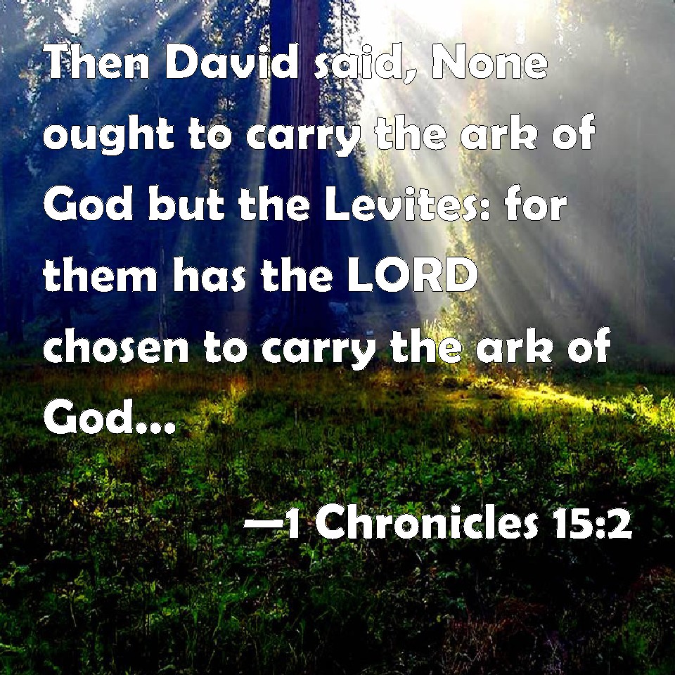 Choose a Background 1 Chronicles 15:2 Then David said, None ought to carry the ark of God but the Levites: for them has the LORD chosen to carry the ark of God, and to minister to him for ever. KJV: Then David said, None ought to carry the ark of God but the Levites: for them hath the LORD chosen to carry the ark of God, and to minister unto him for ever. DRB: Then David said: No one ought to carry the ark of God, but the Levites, whom the Lord hath chosen to carry it, and to minister unto himself for ever. DBT: Then David said, None ought to carry the ark of God but the Levites, for them has Jehovah chosen to carry the ark of God, and to serve him for ever. ERV: Then David said, None ought to carry the ark of God but the Levites: for them hath the LORD chosen to carry the ark of God, and to minister unto him for ever. WBT: Then David said, None ought to carry the ark of God but the Levites: for them hath the LORD chosen to carry the ark of God, and to minister to him for ever. WEB: Then David said, "No one ought to carry the ark of God but the Levites. For Yahweh has chosen them to carry the ark of God, and to minister to him forever." YLT: Then said David, 'None are to carry the ark of God, except the Levites, for on them hath Jehovah fixed to carry the ark of God, and to serve Him — unto the age.'Links 1 Chronicles 15:2 NIV • 1 Chronicles 15:2 NLT • 1 Chronicles 15:2 ESV • 1 Chronicles 15:2 NASB • 1 Chronicles 15:2 KJV • 1 Chronicles 15:2 Interlinear • 1 Chronicles 15:2 Commentaries • 1 Chronicles 15:2 Parallel Texts • 1 Chronicles 15:2 Bible Apps • 1 Chronicles 15:2 Parallel • Bible Hub |