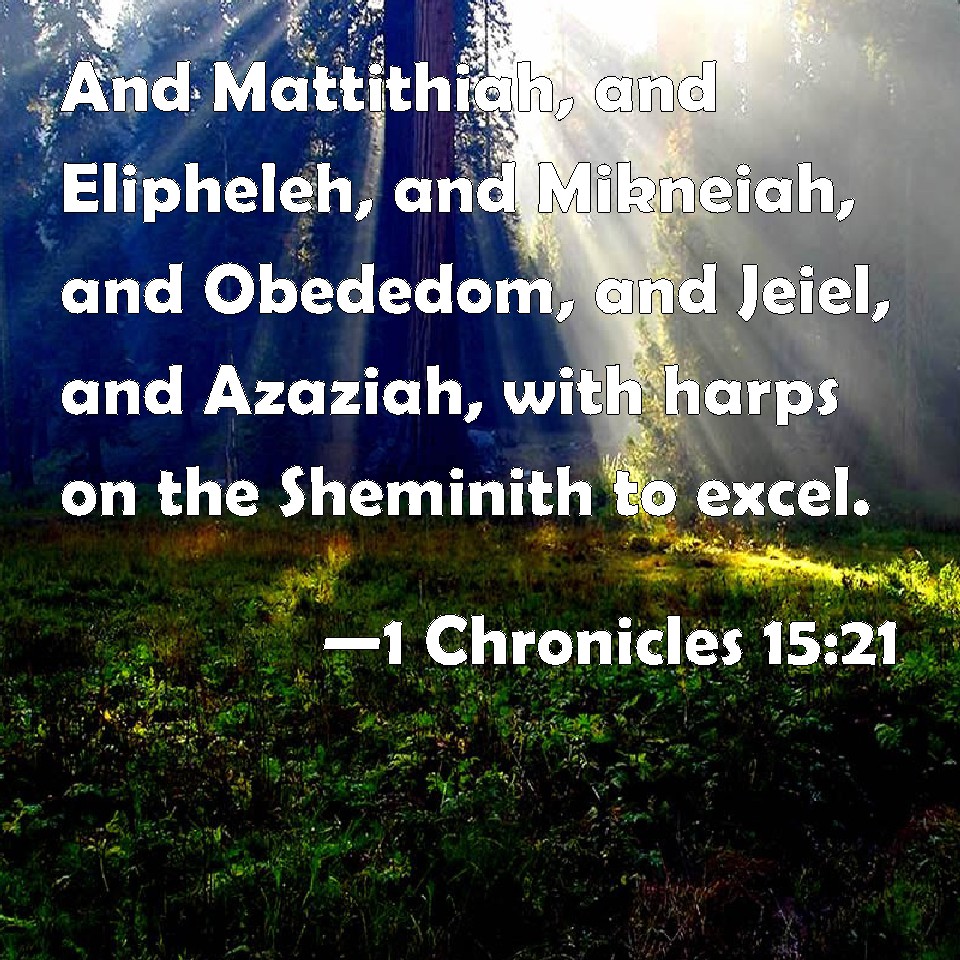 Choose a Background 1 Chronicles 15:21 And Mattithiah, and Elipheleh, and Mikneiah, and Obededom, and Jeiel, and Azaziah, with harps on the Sheminith to excel. KJV: And Mattithiah, and Elipheleh, and Mikneiah, and Obededom, and Jeiel, and Azaziah, with harps on the Sheminith to excel. DRB: And Mathathias, and Eliphalu, and Macenias and Obededom, and Jehiel and Ozaziu, sung a song of victory for the octave upon harps. DBT: and Mattithiah, and Elipheleh, and Mikneiah, and Obed-Edom and Jeiel, and Azaziah, with harps on the Sheminith to lead the singing. ERV: and Mattithiah, and Eliphelehu, and Mikneiah, and Obed-edom, and Jeiel, and Azaziah, with harps set to the Sheminith, to lead. WBT: And Mattithiah, and Elipheleh, and Mikneiah, and Obed-edom, and Jeiel, and Azaziah, with harps on the Sheminith to excel. WEB: and Mattithiah, and Eliphelehu, and Mikneiah, and Obed-Edom, and Jeiel, and Azaziah, with harps tuned to the eight-stringed lyre, to lead. YLT: and Mattithiah, and Elipheleh, and Mikneiah, and Obed-Edom, and Jeiel, and Azaziah, with harps, on the octave, to oversee.Links 1 Chronicles 15:21 NIV • 1 Chronicles 15:21 NLT • 1 Chronicles 15:21 ESV • 1 Chronicles 15:21 NASB • 1 Chronicles 15:21 KJV • 1 Chronicles 15:21 Interlinear • 1 Chronicles 15:21 Commentaries • 1 Chronicles 15:21 Parallel Texts • 1 Chronicles 15:21 Bible Apps • 1 Chronicles 15:21 Parallel • Bible Hub |