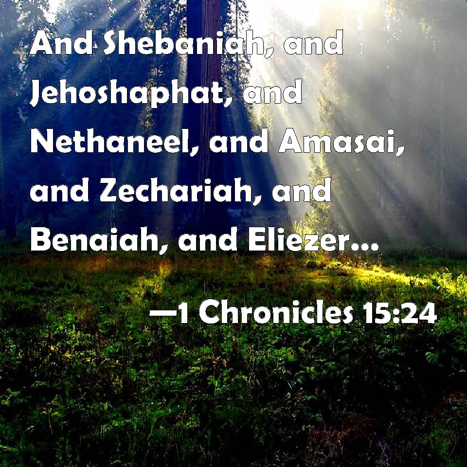 Choose a Background 1 Chronicles 15:24 And Shebaniah, and Jehoshaphat, and Nethaneel, and Amasai, and Zechariah, and Benaiah, and Eliezer, the priests, did blow with the trumpets before the ark of God: and Obededom and Jehiah were doorkeepers for the ark. KJV: And Shebaniah, and Jehoshaphat, and Nethaneel, and Amasai, and Zechariah, and Benaiah, and Eliezer, the priests, did blow with the trumpets before the ark of God: and Obededom and Jehiah were doorkeepers for the ark. DRB: And Sebenias, and Josaphat, and Nathanael, and Amasai, and Zacharias, and Banaias, and Eliezer the priests, sounded with trumpets, before the ark of God: and Obededom and Jehias were porters of the ark. DBT: And Shebaniah, and Jehoshaphat, and Nethaneel, and Amasai, and Zechariah, and Benaiah, and Eliezer, the priests, blew with the trumpets before the ark of God; and Obed-Edom and Jehijah were doorkeepers for the ark. ERV: And Shebaniah, and Joshaphat, and Nethanel, and Amasai, and Zechariah, and Benaiah, and Eliezer, the priests, did blow with the trumpets before the ark of God: and Obed-edom and Jehiah were doorkeepers for the ark. WBT: And Shebaniah, and Jehoshaphat, and Nethaneel, and Amasai, and Zechariah, and Benaiah, and Eliezer the priests, did blow with the trumpets before the ark of God: and Obed-edom and Jehiah were door-keepers for the ark. WEB: Shebaniah, and Joshaphat, and Nethanel, and Amasai, and Zechariah, and Benaiah, and Eliezer, the priests, did blow the trumpets before the ark of God: and Obed-Edom and Jehiah were doorkeepers for the ark. YLT: And Shebaniah, and Joshaphat, and Nethaneel, and Amasai, and Zechariah, and Benaiah, and Eliezer the priests, are blowing with trumpets before the ark of God; and Obed-Edom and Jehiah are gatekeepers for the ark.Links 1 Chronicles 15:24 NIV • 1 Chronicles 15:24 NLT • 1 Chronicles 15:24 ESV • 1 Chronicles 15:24 NASB • 1 Chronicles 15:24 KJV • 1 Chronicles 15:24 Interlinear • 1 Chronicles 15:24 Commentaries • 1 Chronicles 15:24 Parallel Texts • 1 Chronicles 15:24 Bible Apps • 1 Chronicles 15:24 Parallel • Bible Hub |