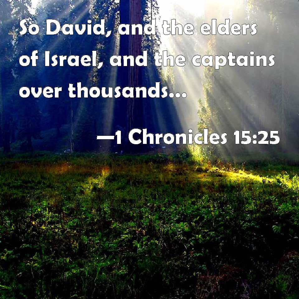 Choose a Background 1 Chronicles 15:25 So David, and the elders of Israel, and the captains over thousands, went to bring up the ark of the covenant of the LORD out of the house of Obededom with joy. KJV: So David, and the elders of Israel, and the captains over thousands, went to bring up the ark of the covenant of the LORD out of the house of Obededom with joy. DRB: So David and all the ancients of Israel, and the captains over thousands, went to bring the ark of the covenant of the Lord out of the house of Obededom with joy. DBT: And David, and the elders of Israel, and the captains over thousands, went to bring up the ark of the covenant of Jehovah out of the house of Obed-Edom with joy. ERV: So David, and the elders of Israel, and the captains over thousands, went to bring up the ark of the covenant of the LORD out of the house of Obed-edom with joy: WBT: So David and the elders of Israel, and the captains over thousands, went to bring up the ark of the covenant of the LORD from the house of Obed-edom with joy. WEB: So David, and the elders of Israel, and the captains over thousands, went to bring up the ark of the covenant of Yahweh out of the house of Obed-Edom with joy. YLT: And it is David, and the elders of Israel, and the heads of the thousands, who are going to bring up the ark of the covenant of Jehovah from the house of Obed-Edom with joy;Links 1 Chronicles 15:25 NIV • 1 Chronicles 15:25 NLT • 1 Chronicles 15:25 ESV • 1 Chronicles 15:25 NASB • 1 Chronicles 15:25 KJV • 1 Chronicles 15:25 Interlinear • 1 Chronicles 15:25 Commentaries • 1 Chronicles 15:25 Parallel Texts • 1 Chronicles 15:25 Bible Apps • 1 Chronicles 15:25 Parallel • Bible Hub |