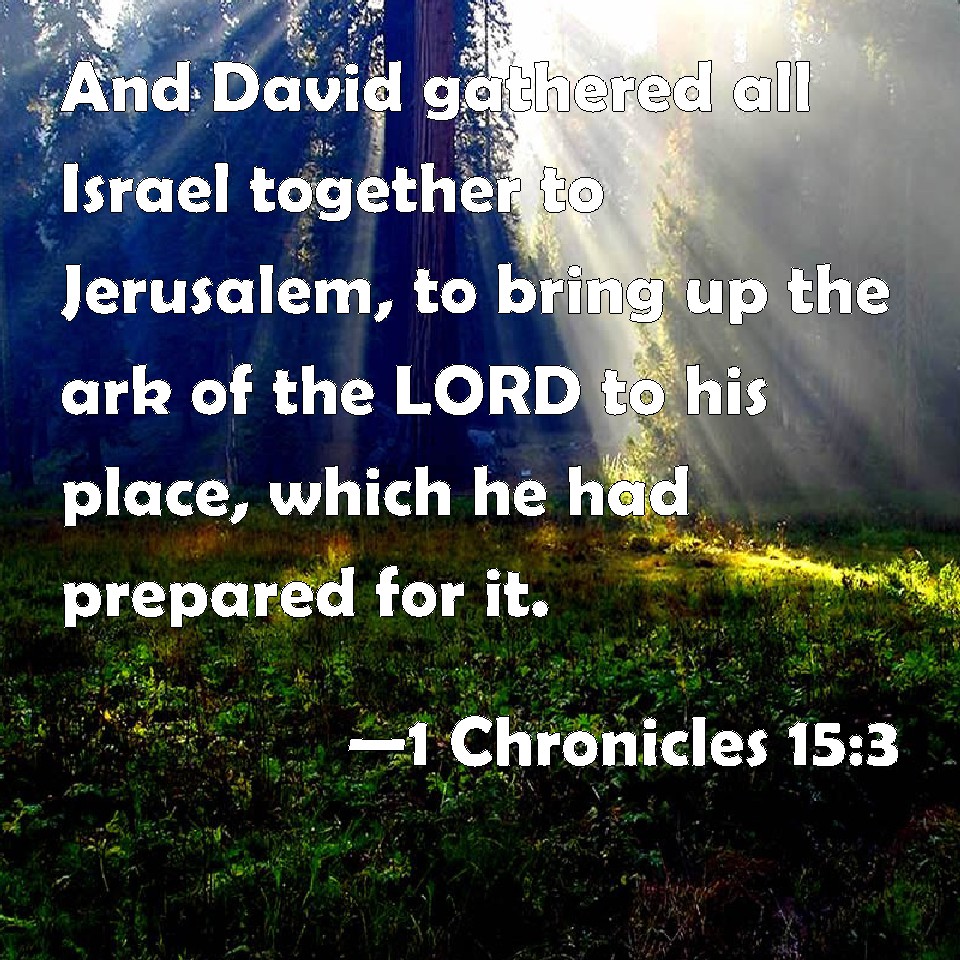 Choose a Background 1 Chronicles 15:3 And David gathered all Israel together to Jerusalem, to bring up the ark of the LORD to his place, which he had prepared for it. KJV: And David gathered all Israel together to Jerusalem, to bring up the ark of the LORD unto his place, which he had prepared for it. DRB: And he gathered all Israel together into Jerusalem, that the ark of God might be brought into its place, which he had prepared for it. DBT: And David assembled all Israel to Jerusalem, to bring up the ark of Jehovah to its place that he had prepared for it. ERV: And David assembled all Israel at Jerusalem, to bring up the ark of the LORD unto its place, which he had prepared for it. WBT: And David assembled all Israel to Jerusalem, to bring up the ark of the LORD to its place, which he had prepared for it. WEB: David assembled all Israel at Jerusalem, to bring up the ark of Yahweh to its place, which he had prepared for it. YLT: And David assembleth all Israel unto Jerusalem, to bring up the ark of Jehovah unto its place that he had prepared for it.Links 1 Chronicles 15:3 NIV • 1 Chronicles 15:3 NLT • 1 Chronicles 15:3 ESV • 1 Chronicles 15:3 NASB • 1 Chronicles 15:3 KJV • 1 Chronicles 15:3 Interlinear • 1 Chronicles 15:3 Commentaries • 1 Chronicles 15:3 Parallel Texts • 1 Chronicles 15:3 Bible Apps • 1 Chronicles 15:3 Parallel • Bible Hub |