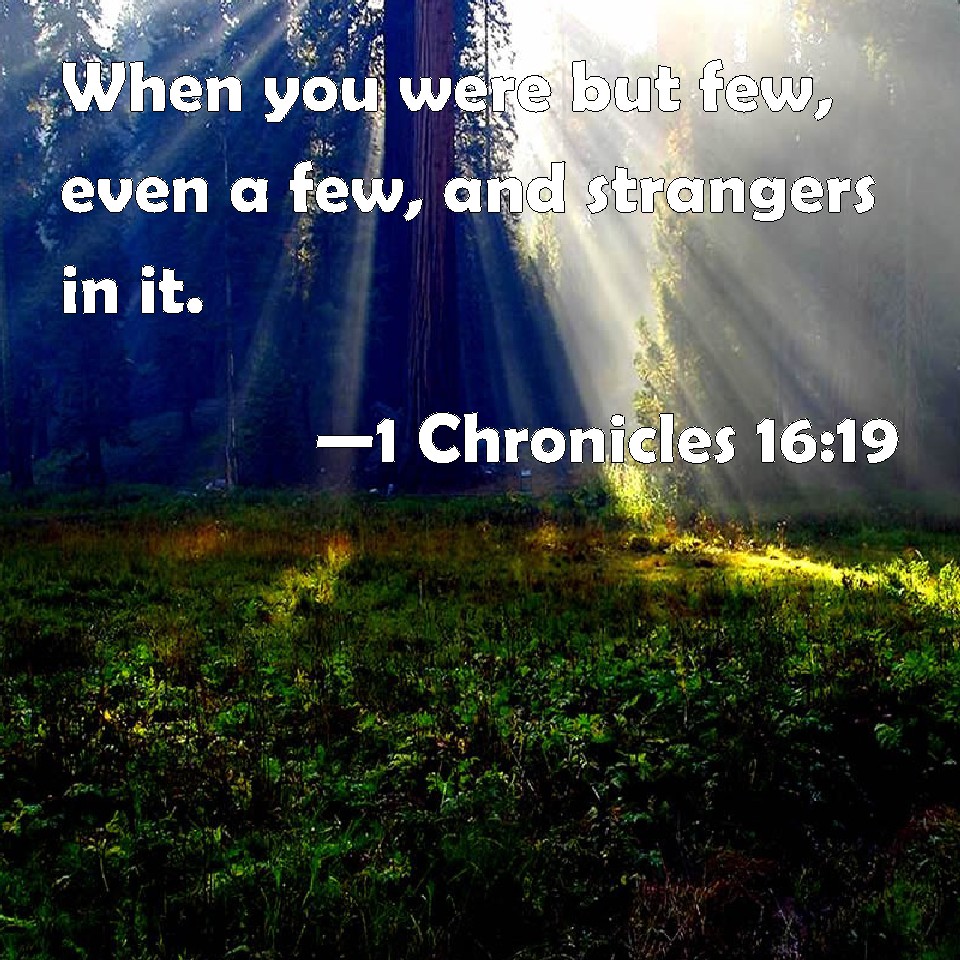 Choose a Background 1 Chronicles 16:19 When you were but few, even a few, and strangers in it. KJV: When ye were but few, even a few, and strangers in it. DRB: When they were but a small number: very few and sojourners in it. DBT: When ye were a few men in number, Of small account, and strangers in it. ERV: When ye were but a few men in number; yea, very few, and sojourners in it; WBT: When ye were but few, even a few, and strangers in it. WEB: when you were but a few men in number, yes, very few, and foreigners were in it. YLT: When ye are few of number, As a little thing, and sojourners in it.Links 1 Chronicles 16:19 NIV • 1 Chronicles 16:19 NLT • 1 Chronicles 16:19 ESV • 1 Chronicles 16:19 NASB • 1 Chronicles 16:19 KJV • 1 Chronicles 16:19 Interlinear • 1 Chronicles 16:19 Commentaries • 1 Chronicles 16:19 Parallel Texts • 1 Chronicles 16:19 Bible Apps • 1 Chronicles 16:19 Parallel • Bible Hub |