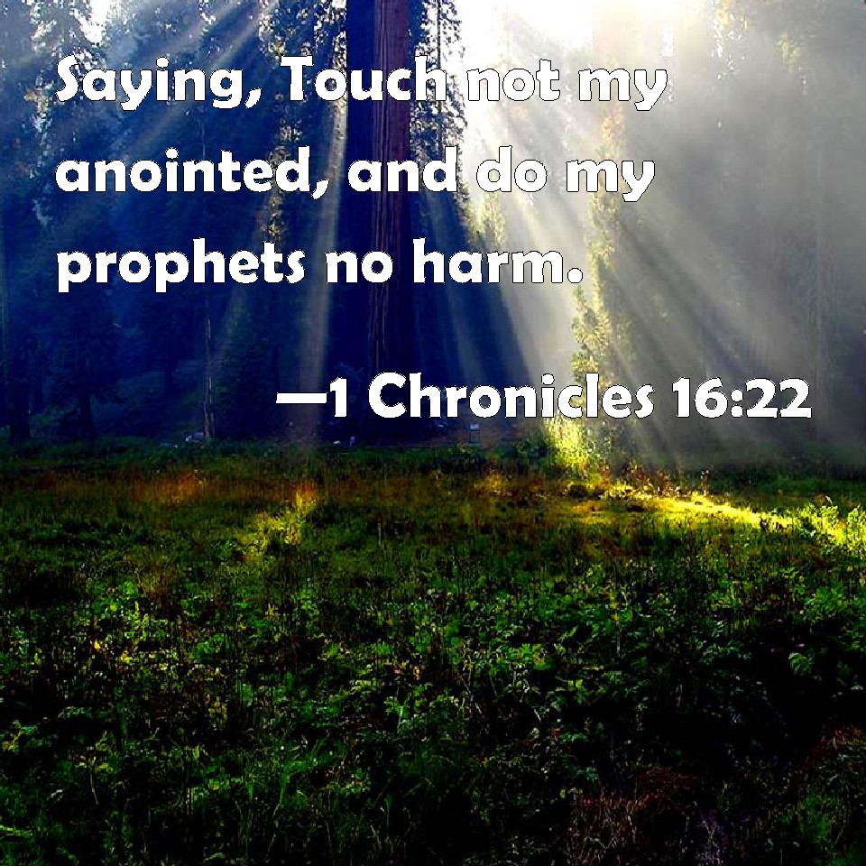 Choose a Background 1 Chronicles 16:22 Saying, Touch not my anointed, and do my prophets no harm. KJV: Saying, Touch not mine anointed, and do my prophets no harm. DRB: Touch not my anointed: and do no evil to my prophets. DBT: Saying, Touch not mine anointed ones, And do my prophets no harm. ERV: Saying, Touch not mine anointed ones, and do my prophets no harm. WBT: Saying, Touch not my anointed, and do my prophets no harm. WEB: "Don't touch my anointed ones! Do my prophets no harm!" YLT: Come not against Mine anointed ones, And against My prophets do not evil.Links 1 Chronicles 16:22 NIV • 1 Chronicles 16:22 NLT • 1 Chronicles 16:22 ESV • 1 Chronicles 16:22 NASB • 1 Chronicles 16:22 KJV • 1 Chronicles 16:22 Interlinear • 1 Chronicles 16:22 Commentaries • 1 Chronicles 16:22 Parallel Texts • 1 Chronicles 16:22 Bible Apps • 1 Chronicles 16:22 Parallel • Bible Hub |