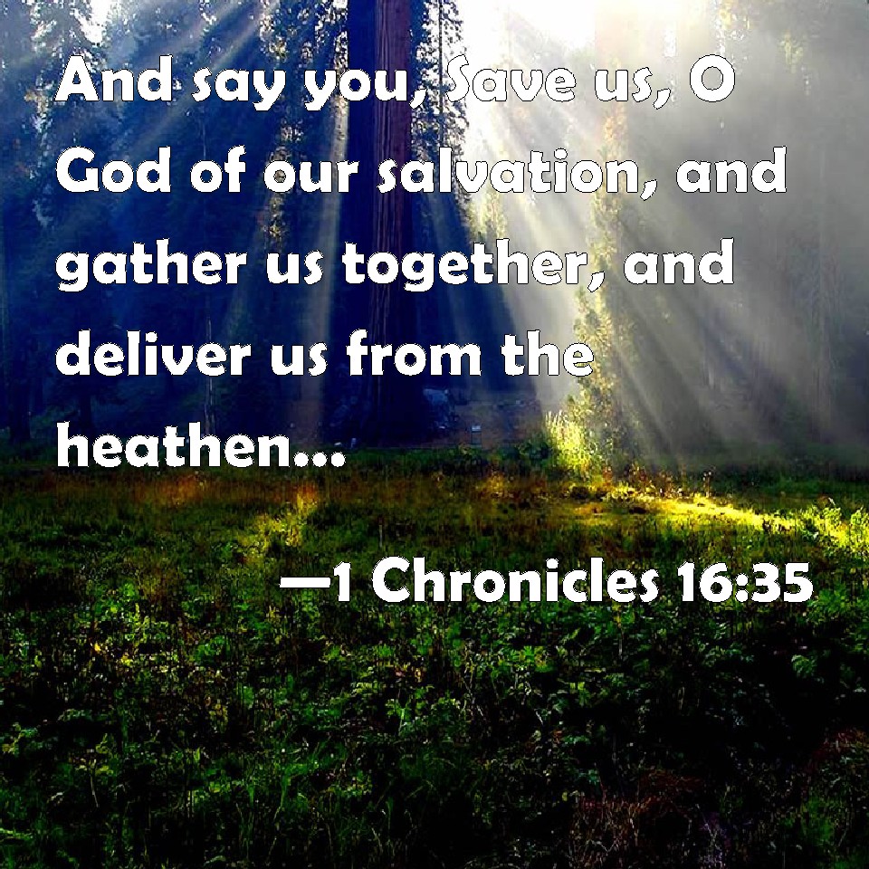 Choose a Background 1 Chronicles 16:35 And say you, Save us, O God of our salvation, and gather us together, and deliver us from the heathen, that we may give thanks to your holy name, and glory in your praise. KJV: And say ye, Save us, O God of our salvation, and gather us together, and deliver us from the heathen, that we may give thanks to thy holy name, and glory in thy praise. DRB: And say ye: Save us, O God our saviour: and gather us together, and deliver us from the nations, that we may give glory to thy holy name, and may rejoice in singing thy praises. DBT: And say, Save us, O God of our salvation, And gather us, and deliver us from the nations, To give thanks unto thy holy name, To triumph in thy praise. ERV: And say ye, Save us, O God of our salvation, and gather us together and deliver us from the nations, to give thanks unto thy holy name, and to triumph in thy praise. WBT: And say ye, Save us, O God of our salvation, and gather us together, and deliver us from the heathen, that we may give thanks to thy holy name, and glory in thy praise. WEB: Say, "Save us, God of our salvation! Gather us together and deliver us from the nations, to give thanks to your holy name, to triumph in your praise." YLT: And say, Save us, O God of our salvation, And gather us, and deliver us from the nations, To give thanks to Thy holy name, To triumph in Thy praise.Links 1 Chronicles 16:35 NIV • 1 Chronicles 16:35 NLT • 1 Chronicles 16:35 ESV • 1 Chronicles 16:35 NASB • 1 Chronicles 16:35 KJV • 1 Chronicles 16:35 Interlinear • 1 Chronicles 16:35 Commentaries • 1 Chronicles 16:35 Parallel Texts • 1 Chronicles 16:35 Bible Apps • 1 Chronicles 16:35 Parallel • Bible Hub |