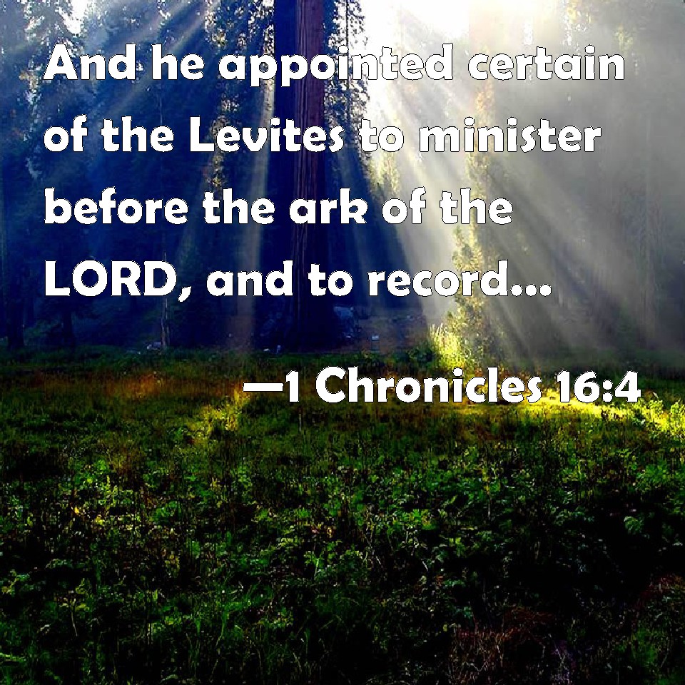 Choose a Background 1 Chronicles 16:4 And he appointed certain of the Levites to minister before the ark of the LORD, and to record, and to thank and praise the LORD God of Israel: KJV: And he appointed certain of the Levites to minister before the ark of the LORD, and to record, and to thank and praise the LORD God of Israel: DRB: And he appointed Levites to minister before the ark of the Lord, and to remember his works, and to glorify, and praise the Lord God of Israel. DBT: And he appointed certain of the Levites to do the service before the ark of Jehovah, and to celebrate, and to thank and praise Jehovah the God of Israel: ERV: And he appointed certain of the Levites to minister before the ark of the LORD, and to celebrate and to thank and praise the LORD, the God of Israel: WBT: And he appointed certain of the Levites to minister before the ark of the LORD, and to record, and to thank and praise the LORD God of Israel: WEB: He appointed certain of the Levites to minister before the ark of Yahweh, and to celebrate and to thank and praise Yahweh, the God of Israel: YLT: And he putteth before the ark of Jehovah, of the Levites, ministers, even to make mention of, and to thank, and to give praise to Jehovah, God of Israel,Links 1 Chronicles 16:4 NIV • 1 Chronicles 16:4 NLT • 1 Chronicles 16:4 ESV • 1 Chronicles 16:4 NASB • 1 Chronicles 16:4 KJV • 1 Chronicles 16:4 Interlinear • 1 Chronicles 16:4 Commentaries • 1 Chronicles 16:4 Parallel Texts • 1 Chronicles 16:4 Bible Apps • 1 Chronicles 16:4 Parallel • Bible Hub |