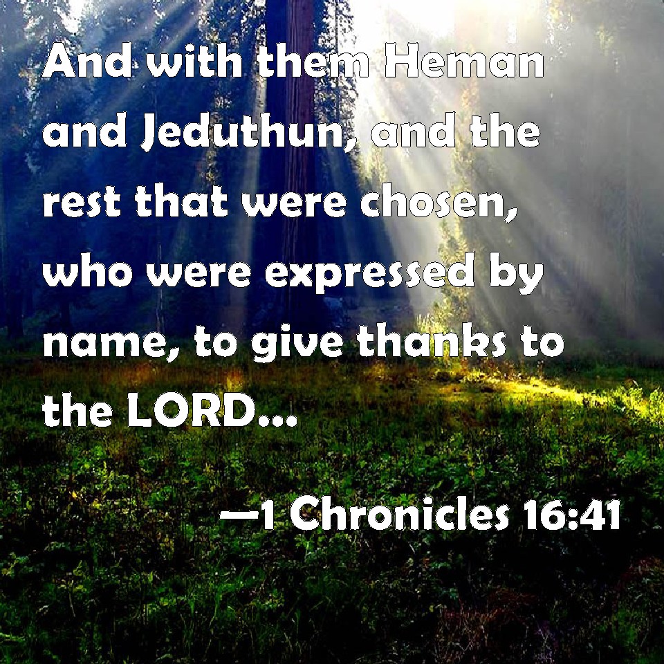 Choose a Background 1 Chronicles 16:41 And with them Heman and Jeduthun, and the rest that were chosen, who were expressed by name, to give thanks to the LORD, because his mercy endures for ever; KJV: And with them Heman and Jeduthun, and the rest that were chosen, who were expressed by name, to give thanks to the LORD, because his mercy endureth for ever; DRB: And after him Heman, and Idithun, and the rest that were chosen, every one by his name to give praise to the Lord: because his mercy endureth for ever. DBT: and with them Heman and Jeduthun, and the rest that were chosen, who were expressed by name, to give thanks to Jehovah, because his loving-kindness endureth for ever; ERV: and with them Heman and Jeduthun, and the rest that were chosen, who were expressed by name, to give thanks to the LORD, because his mercy endureth for ever; WBT: And with them Heman and Jeduthun, and the rest that were chosen, who were expressed by name, to give thanks to the LORD, because his mercy endureth for ever; WEB: and with them Heman and Jeduthun, and the rest who were chosen, who were mentioned by name, to give thanks to Yahweh, because his loving kindness endures forever; YLT: And with them are Heman and Jeduthun, and the rest of those chosen, who were defined by name, to give thanks to Jehovah, for to the age is His kindness,Links 1 Chronicles 16:41 NIV • 1 Chronicles 16:41 NLT • 1 Chronicles 16:41 ESV • 1 Chronicles 16:41 NASB • 1 Chronicles 16:41 KJV • 1 Chronicles 16:41 Interlinear • 1 Chronicles 16:41 Commentaries • 1 Chronicles 16:41 Parallel Texts • 1 Chronicles 16:41 Bible Apps • 1 Chronicles 16:41 Parallel • Bible Hub |