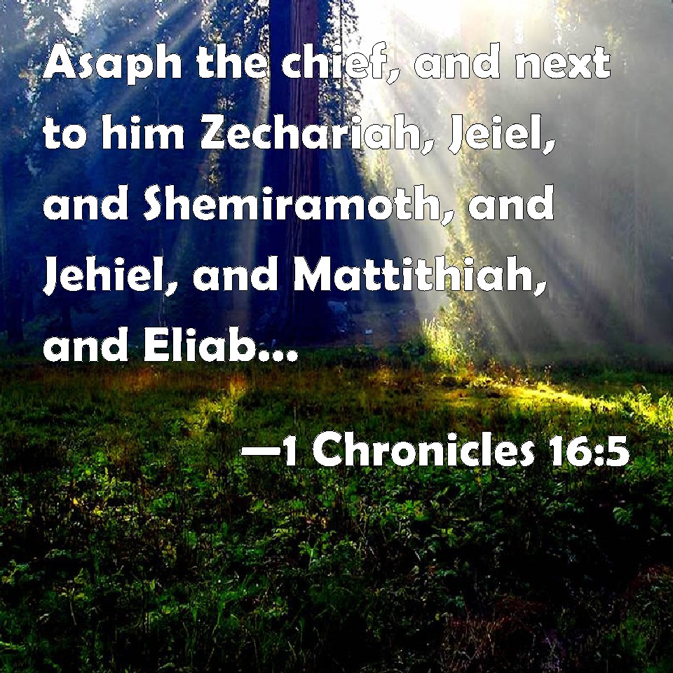 Choose a Background 1 Chronicles 16:5 Asaph the chief, and next to him Zechariah, Jeiel, and Shemiramoth, and Jehiel, and Mattithiah, and Eliab, and Benaiah, and Obededom: and Jeiel with psalteries and with harps; but Asaph made a sound with cymbals; KJV: Asaph the chief, and next to him Zechariah, Jeiel, and Shemiramoth, and Jehiel, and Mattithiah, and Eliab, and Benaiah, and Obededom: and Jeiel with psalteries and with harps; but Asaph made a sound with cymbals; DRB: Asaph the chief, and next after him Zacharias: moreover Jahiel, and Semiramoth, and Jehiel, and Mathathias, and Eliab, and Banaias, and Obededom: and Jehiel over the instruments of psaltery, and harps: and Asaph sounded with cymbals: DBT: Asaph the chief, and second to him Zechariah, Jeiel, and Shemiramoth, and Jehiel, and Mattithiah, and Eliab, and Benaiah and Obed-Edom, and Jeiel, with instruments of lutes and with harps; and Asaph sounding with cymbals; ERV: Asaph the chief, and second to him Zechariah, Jeiel, and Shemiramoth, and Jehiel, and Mattithiah, and Eliab, and Benaiah, and Obed-edom, and Jeiel, with psalteries and with harps; and Asaph with cymbals, sounding aloud; WBT: Asaph the chief, and next to him Zechariah, Jeiel, and Shemiramoth, and Jehiel, and Mattithiah, and Eliab, and Benaiah, and Obed-edom: and Jeiel with psalteries and with harps; but Asaph made a sound with cymbals; WEB: Asaph the chief, and second to him Zechariah, Jeiel, and Shemiramoth, and Jehiel, and Mattithiah, and Eliab, and Benaiah, and Obed-Edom, and Jeiel, with stringed instruments and with harps; and Asaph with cymbals, sounding aloud; YLT: Asaph the head, and his second Zechariah; Jeiel, and Shemiramoth, and Jehiel, and Mattithiah, and Eliab, and Benaiah, and Obed-Edom, and Jeiel, with instruments of psalteries, and with harps; and Asaph with cymbals is sounding;Links 1 Chronicles 16:5 NIV • 1 Chronicles 16:5 NLT • 1 Chronicles 16:5 ESV • 1 Chronicles 16:5 NASB • 1 Chronicles 16:5 KJV • 1 Chronicles 16:5 Interlinear • 1 Chronicles 16:5 Commentaries • 1 Chronicles 16:5 Parallel Texts • 1 Chronicles 16:5 Bible Apps • 1 Chronicles 16:5 Parallel • Bible Hub |