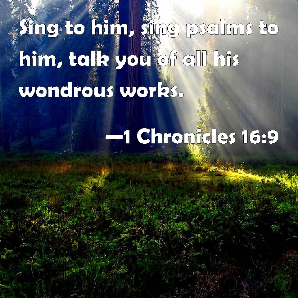 Choose a Background 1 Chronicles 16:9 Sing to him, sing psalms to him, talk you of all his wondrous works. KJV: Sing unto him, sing psalms unto him, talk ye of all his wondrous works. DRB: Sing to him, yea, sing praises to him: and relate all his wondrous works. DBT: Sing unto him, sing psalms unto him; Meditate upon all his wondrous works. ERV: Sing unto him, sing praises unto him; talk ye of all his marvelous works. WBT: Sing to him, sing psalms to him, talk ye of all his wonderous works. WEB: Sing to him. Sing praises to him. Tell of all his marvelous works. YLT: Sing ye to Him, sing psalms to Him, Meditate on all His wonders.Links 1 Chronicles 16:9 NIV • 1 Chronicles 16:9 NLT • 1 Chronicles 16:9 ESV • 1 Chronicles 16:9 NASB • 1 Chronicles 16:9 KJV • 1 Chronicles 16:9 Interlinear • 1 Chronicles 16:9 Commentaries • 1 Chronicles 16:9 Parallel Texts • 1 Chronicles 16:9 Bible Apps • 1 Chronicles 16:9 Parallel • Bible Hub |