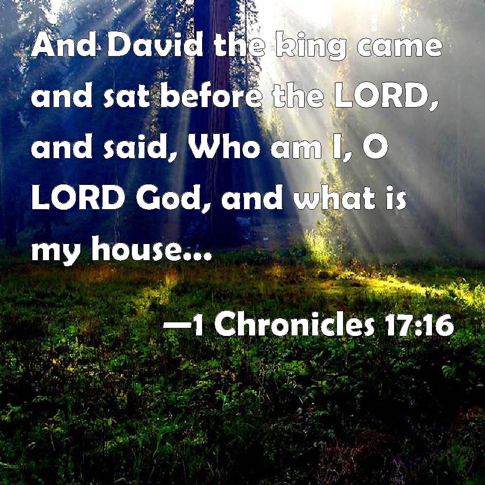 Choose a Background 1 Chronicles 17:16 And David the king came and sat before the LORD, and said, Who am I, O LORD God, and what is my house, that you have brought me till now? KJV: And David the king came and sat before the LORD, and said, Who am I, O LORD God, and what is mine house, that thou hast brought me hitherto? DRB: And king David came and sat before the Lord, and said: Who am I, O Lord God, and what is my house, that thou shouldst give such things to me? DBT: And king David went in and sat before Jehovah, and said, Who am I, Jehovah Elohim, and what is my house, that thou hast brought me hitherto? ERV: Then David the king went in, and sat before the LORD; and he said, Who am I, O LORD God, and what is my house, that thou hast brought me thus far? WBT: And David the king came and sat before the LORD, and said, Who am I, O LORD God, and what is my house, that thou hast brought me hitherto? WEB: Then David the king went in, and sat before Yahweh; and he said, "Who am I, Yahweh God, and what is my house, that you have brought me thus far? YLT: And David the king cometh in and sitteth before Jehovah, and saith, 'Who am I, O Jehovah God, and what my house, that Thou hast brought me hitherto?Links 1 Chronicles 17:16 NIV • 1 Chronicles 17:16 NLT • 1 Chronicles 17:16 ESV • 1 Chronicles 17:16 NASB • 1 Chronicles 17:16 KJV • 1 Chronicles 17:16 Interlinear • 1 Chronicles 17:16 Commentaries • 1 Chronicles 17:16 Parallel Texts • 1 Chronicles 17:16 Bible Apps • 1 Chronicles 17:16 Parallel • Bible Hub |
