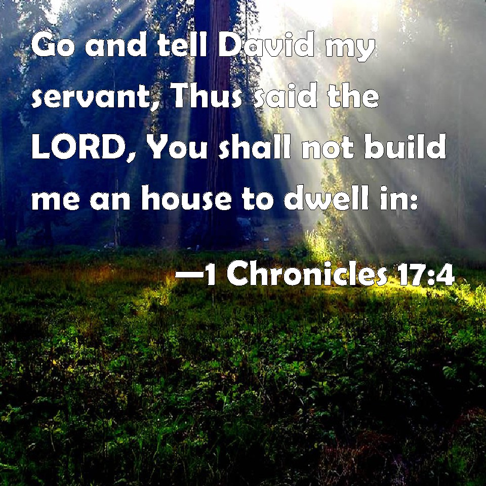 Choose a Background 1 Chronicles 17:4 Go and tell David my servant, Thus said the LORD, You shall not build me an house to dwell in: KJV: Go and tell David my servant, Thus saith the LORD, Thou shalt not build me an house to dwell in: DRB: Go, and speak to David my servant: Thus saith the Lord: Thou shalt not build me a house to dwell in. DBT: Go and say to David my servant, Thus saith Jehovah: Thou shalt not build me a house to dwell in; ERV: Go and tell David my servant, Thus saith the LORD, Thou shalt not build me an house to dwell in: WBT: Go and tell David my servant, Thus saith the LORD, Thou shalt not build me a house to dwell in: WEB: "Go and tell David my servant, 'Thus says Yahweh, "You shall not build me a house to dwell in; YLT: 'Go, and thou hast said unto David My servant, Thus said Jehovah, Thou dost not build for Me the house to dwell in:Links 1 Chronicles 17:4 NIV • 1 Chronicles 17:4 NLT • 1 Chronicles 17:4 ESV • 1 Chronicles 17:4 NASB • 1 Chronicles 17:4 KJV • 1 Chronicles 17:4 Interlinear • 1 Chronicles 17:4 Commentaries • 1 Chronicles 17:4 Parallel Texts • 1 Chronicles 17:4 Bible Apps • 1 Chronicles 17:4 Parallel • Bible Hub |