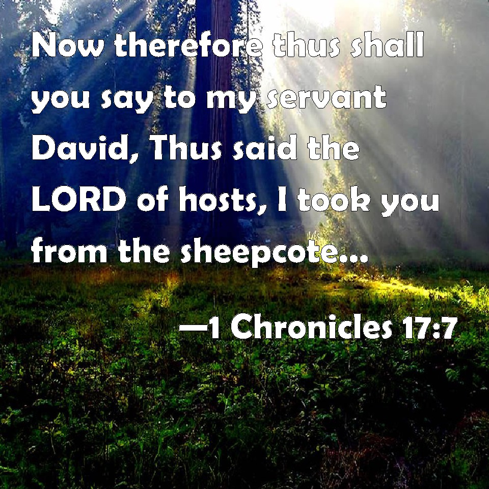 Choose a Background 1 Chronicles 17:7 Now therefore thus shall you say to my servant David, Thus said the LORD of hosts, I took you from the sheepcote, even from following the sheep, that you should be ruler over my people Israel: KJV: Now therefore thus shalt thou say unto my servant David, Thus saith the LORD of hosts, I took thee from the sheepcote, even from following the sheep, that thou shouldest be ruler over my people Israel: DRB: Now therefore thus shalt thou say to my servant David: Thus saith the Lord of hosts: I took thee from the pastures, from following the flock, that thou shouldst be ruler of my people Israel. DBT: And now, thus shalt thou say unto my servant David, Thus saith Jehovah of hosts: I took thee from the pasture-grounds, from following the sheep, to be prince over my people Israel; ERV: Now therefore thus shalt thou say unto my servant David, Thus saith the LORD of hosts, I took thee from the sheepcote, from following the sheep, that thou shouldest be prince over my people Israel: WBT: Now therefore thus shalt thou say to my servant David, Thus saith the LORD of hosts, I took thee from the sheep-cote, even from following the sheep, that thou shouldst be ruler over my people Israel: WEB: "Now therefore, you shall tell my servant David, 'Thus says Yahweh of Armies, "I took you from the sheep pen, from following the sheep, that you should be prince over my people Israel. YLT: 'And now, thus dost thou say to My servant, to David, Thus said Jehovah of Hosts, I have taken thee from the habitation, from after the sheep, to be leader over My people Israel,Links 1 Chronicles 17:7 NIV • 1 Chronicles 17:7 NLT • 1 Chronicles 17:7 ESV • 1 Chronicles 17:7 NASB • 1 Chronicles 17:7 KJV • 1 Chronicles 17:7 Interlinear • 1 Chronicles 17:7 Commentaries • 1 Chronicles 17:7 Parallel Texts • 1 Chronicles 17:7 Bible Apps • 1 Chronicles 17:7 Parallel • Bible Hub |