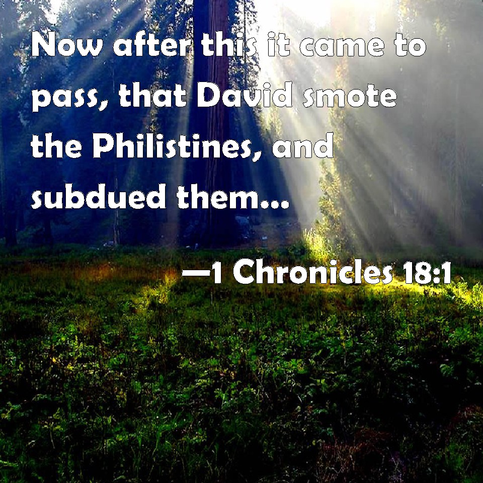 Choose a Background 1 Chronicles 18:1 Now after this it came to pass, that David smote the Philistines, and subdued them, and took Gath and her towns out of the hand of the Philistines. KJV: Now after this it came to pass, that David smote the Philistines, and subdued them, and took Gath and her towns out of the hand of the Philistines. DRB: And it came to pass after this, that David defeated the Philistines, and humbled them, and took away Geth, and her daughters out of the hands of the Philistines, DBT: And after this it came to pass that David smote the Philistines, and subdued them, and took Gath and its towns out of the hand of the Philistines. ERV: And after this it came to pass, that David smote the Philistines, and subdued them, and took Gath and her towns out of the hand of the Philistines. WBT: Now after this it came to pass that David smote the Philistines, and subdued them, and took Gath and its towns out of the hand of the Philistines. WEB: After this it happened, that David struck the Philistines, and subdued them, and took Gath and its towns out of the hand of the Philistines. YLT: And it cometh to pass after this, that David smiteth the Philistines, and humbleth them, and taketh Gath and its small towns out of the hand of the Philistines;Links 1 Chronicles 18:1 NIV • 1 Chronicles 18:1 NLT • 1 Chronicles 18:1 ESV • 1 Chronicles 18:1 NASB • 1 Chronicles 18:1 KJV • 1 Chronicles 18:1 Interlinear • 1 Chronicles 18:1 Commentaries • 1 Chronicles 18:1 Parallel Texts • 1 Chronicles 18:1 Bible Apps • 1 Chronicles 18:1 Parallel • Bible Hub |