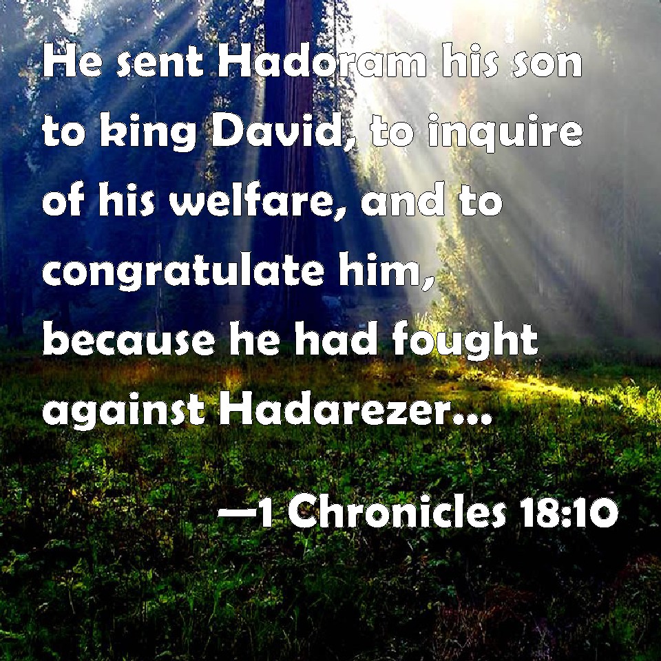 Choose a Background 1 Chronicles 18:10 He sent Hadoram his son to king David, to inquire of his welfare, and to congratulate him, because he had fought against Hadarezer, and smitten him; (for Hadarezer had war with Tou;) and with him all manner of vessels of gold and silver and brass. KJV: He sent Hadoram his son to king David, to inquire of his welfare, and to congratulate him, because he had fought against Hadarezer, and smitten him; (for Hadarezer had war with Tou;) and with him all manner of vessels of gold and silver and brass. DRB: He sent Adoram his son to king David, to desire peace of him, and to congratulate him that he had defeated and overthrown Adarezer: for Thou was an enemy to Adarezer. DBT: and he sent Hadoram his son to king David to inquire of his welfare, and to congratulate him, because he had fought against Hadarezer and smitten him; for Hadarezer was continually at war with Tou; he sent also all manner of vessels of gold and silver and bronze. ERV: he sent Hadoram his son to king David, to salute him, and to bless him, because he had fought against Hadarezer and smitten him; for Hadarezer had wars with Tou; and he had with him all manner of vessels of gold and silver and brass. WBT: He sent Hadoram his son to king David to inquire of his welfare, and to congratulate him, because he had fought against Hadarezer, and smitten him; (for Hadarezer had warred with Tou;) and with him all manner of vessels of gold, and silver, and brass. WEB: he sent Hadoram his son to king David, to Greet him, and to bless him, because he had fought against Hadadezer and struck him; (for Hadadezer had wars with Tou;) and [he had with him] all kinds of vessels of gold and silver and brass. YLT: and he sendeth Hadoram his son unto king David, to ask of him of peace, and to bless him (because that he hath fought against Hadarezer, and smiteth him, for a man of wars with Tou had Hadarezer been,) and all kinds of vessels, of gold, and silver, and brass;Links 1 Chronicles 18:10 NIV • 1 Chronicles 18:10 NLT • 1 Chronicles 18:10 ESV • 1 Chronicles 18:10 NASB • 1 Chronicles 18:10 KJV • 1 Chronicles 18:10 Interlinear • 1 Chronicles 18:10 Commentaries • 1 Chronicles 18:10 Parallel Texts • 1 Chronicles 18:10 Bible Apps • 1 Chronicles 18:10 Parallel • Bible Hub |