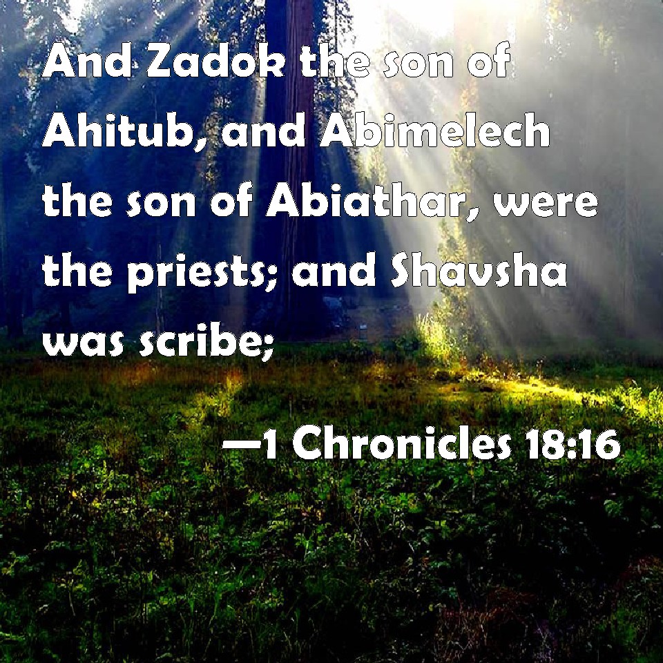 Choose a Background 1 Chronicles 18:16 And Zadok the son of Ahitub, and Abimelech the son of Abiathar, were the priests; and Shavsha was scribe; KJV: And Zadok the son of Ahitub, and Abimelech the son of Abiathar, were the priests; and Shavsha was scribe; DRB: And Sadoc the son of Achitob, and Achimelech the son of Abiathar, were the priests: and Susa, scribe. DBT: and Zadok the son of Ahitub, and Abimelech the son of Abiathar, were the priests; and Shavsha was scribe; ERV: and Zadok the son of Ahitub, and Abimelech the son of Abiathar, were priests; and Shavsha was scribe; WBT: And Zadok the son of Ahitub, and Abimelech the son of Abiathar, were the priests; and Shavsha was scribe; WEB: and Zadok the son of Ahitub, and Abimelech the son of Abiathar, were priests; and Shavsha was scribe; YLT: and Zadok son of Ahitub, and Abimelech son of Abiathar, are priests, and Shavsha is scribe,Links 1 Chronicles 18:16 NIV • 1 Chronicles 18:16 NLT • 1 Chronicles 18:16 ESV • 1 Chronicles 18:16 NASB • 1 Chronicles 18:16 KJV • 1 Chronicles 18:16 Interlinear • 1 Chronicles 18:16 Commentaries • 1 Chronicles 18:16 Parallel Texts • 1 Chronicles 18:16 Bible Apps • 1 Chronicles 18:16 Parallel • Bible Hub |