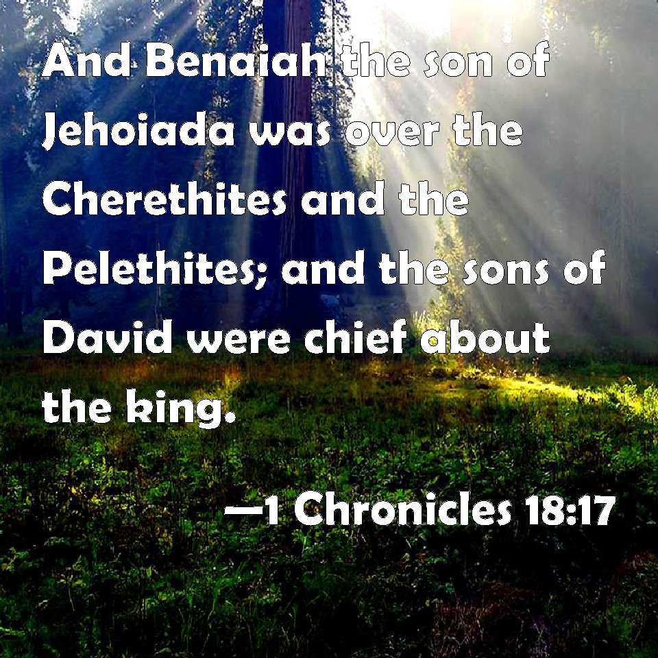 1 Chronicles 18:17 And Benaiah the son of Jehoiada was over the Cherethites and the Pelethites; and the sons of David were chief about the king.