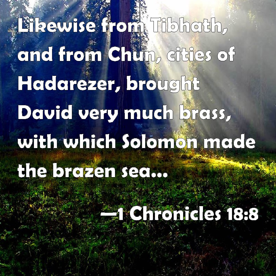 Choose a Background 1 Chronicles 18:8 Likewise from Tibhath, and from Chun, cities of Hadarezer, brought David very much brass, with which Solomon made the brazen sea, and the pillars, and the vessels of brass. KJV: Likewise from Tibhath, and from Chun, cities of Hadarezer, brought David very much brass, wherewith Solomon made the brasen sea, and the pillars, and the vessels of brass. DRB: Likewise out of Thebath and Chun, cities of Adarezer, he brought very much brass, of which Solomon made the brazen sea, and the pillars, and the vessels of brass. DBT: And from Tibhath, and from Chun, cities of Hadarezer, David took very much brass, of which Solomon made the brazen sea, and the pillars, and the vessels of brass. ERV: And from Tibhath and from Cun, cities of Hadarezer, David took very much brass, wherewith Solomon made the brasen sea, and the pillars, and the vessels of brass. WBT: Likewise from Tibhath, and from Chun, cities of Hadarezer, David brought very much brass, with which Solomon made the brazen sea, and the pillars, and the vessels of brass. WEB: From Tibhath and from Cun, cities of Hadadezer, David took very much brass, with which Solomon made the bronze sea, and the pillars, and the vessels of brass. YLT: and from Tibhath, and from Chun, cities of Hadarezer, hath David taken very much brass; with it hath Solomon made the brazen sea, and the pillars, and the vessels of brass.Links 1 Chronicles 18:8 NIV • 1 Chronicles 18:8 NLT • 1 Chronicles 18:8 ESV • 1 Chronicles 18:8 NASB • 1 Chronicles 18:8 KJV • 1 Chronicles 18:8 Interlinear • 1 Chronicles 18:8 Commentaries • 1 Chronicles 18:8 Parallel Texts • 1 Chronicles 18:8 Bible Apps • 1 Chronicles 18:8 Parallel • Bible Hub |