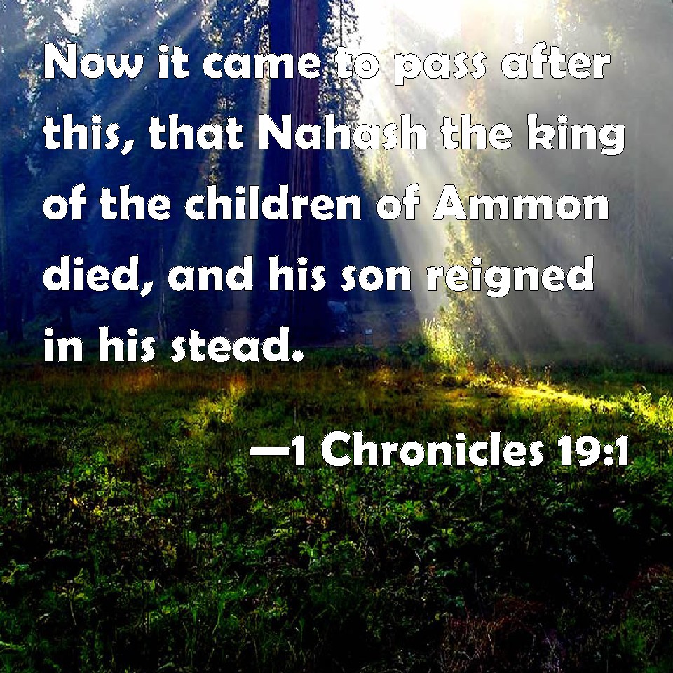 Choose a Background 1 Chronicles 19:1 Now it came to pass after this, that Nahash the king of the children of Ammon died, and his son reigned in his stead. KJV: Now it came to pass after this, that Nahash the king of the children of Ammon died, and his son reigned in his stead. DRB: Now it came to pass that Naas the king of the children of Ammon died, and his son reigned is his stead. DBT: And it came to pass after this that Nahash king of the children of Ammon died, and his son reigned in his stead. ERV: And it came to pass after this, that Nahash the king of the children of Ammon died, and his son reigned in his stead. WBT: Now it came to pass after this, that Nahash the king of the children of Ammon died, and his son reigned in his stead. WEB: It happened after this, that Nahash the king of the children of Ammon died, and his son reigned in his place. YLT: And it cometh to pass after this, that Nahash king of the sons of Ammon dieth, and his son reigneth in his stead,Links 1 Chronicles 19:1 NIV • 1 Chronicles 19:1 NLT • 1 Chronicles 19:1 ESV • 1 Chronicles 19:1 NASB • 1 Chronicles 19:1 KJV • 1 Chronicles 19:1 Interlinear • 1 Chronicles 19:1 Commentaries • 1 Chronicles 19:1 Parallel Texts • 1 Chronicles 19:1 Bible Apps • 1 Chronicles 19:1 Parallel • Bible Hub |