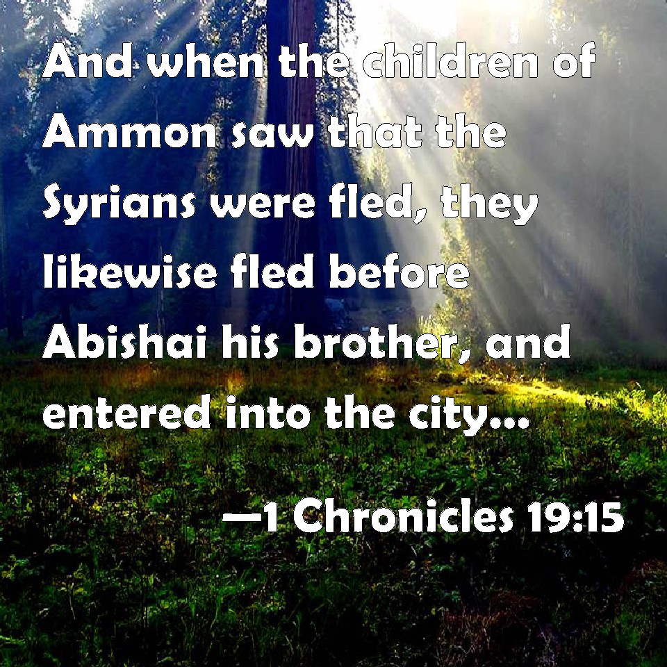 Choose a Background 1 Chronicles 19:15 And when the children of Ammon saw that the Syrians were fled, they likewise fled before Abishai his brother, and entered into the city. Then Joab came to Jerusalem. KJV: And when the children of Ammon saw that the Syrians were fled, they likewise fled before Abishai his brother, and entered into the city. Then Joab came to Jerusalem. DRB: And the children of Ammon seeing that the Syrians were fled, they likewise fled from Abisai his brother, and went into the city: and Joab also returned to Jerusalem. DBT: And when the children of Ammon saw that the Syrians fled, they likewise fled before Abishai his brother, and entered into the city. And Joab came to Jerusalem. ERV: And when the children of Ammon saw that the Syrians were fled, they likewise fled before Abishai his brother, and entered into the city. Then Joab came to Jerusalem. WBT: And when the children of Ammon saw that the Syrians had fled, they likewise fled before Abishai his brother, and entered into the city. Then Joab came to Jerusalem. WEB: When the children of Ammon saw that the Syrians had fled, they likewise fled before Abishai his brother, and entered into the city. Then Joab came to Jerusalem. YLT: and the sons of Ammon have seen that Aram hath fled, and they flee — they also — from the face of Abishai his brother, and go in to the city. And Joab cometh in to Jerusalem.Links 1 Chronicles 19:15 NIV • 1 Chronicles 19:15 NLT • 1 Chronicles 19:15 ESV • 1 Chronicles 19:15 NASB • 1 Chronicles 19:15 KJV • 1 Chronicles 19:15 Interlinear • 1 Chronicles 19:15 Commentaries • 1 Chronicles 19:15 Parallel Texts • 1 Chronicles 19:15 Bible Apps • 1 Chronicles 19:15 Parallel • Bible Hub |