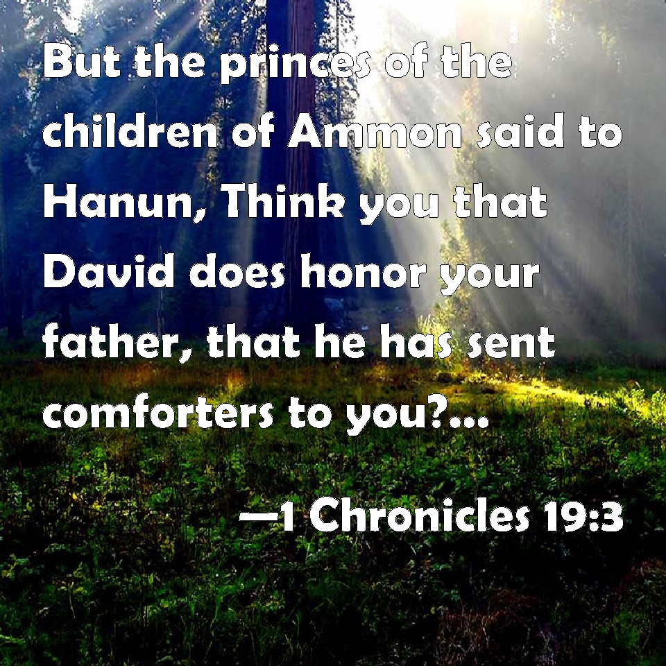 Choose a Background 1 Chronicles 19:3 But the princes of the children of Ammon said to Hanun, Think you that David does honor your father, that he has sent comforters to you? are not his servants come to you for to search, and to overthrow, and to spy out the land? KJV: But the princes of the children of Ammon said to Hanun, Thinkest thou that David doth honour thy father, that he hath sent comforters unto thee? are not his servants come unto thee for to search, and to overthrow, and to spy out the land? DRB: The princes of the children of Ammon said to Hanon: Thou thinkest perhaps that David to do honour to thy father hath sent comforters to thee: and thou dost not take notice, that his servants are come to thee to consider, and search, and spy out thy land. DBT: And the princes of the children of Ammon said to Hanun, Is it, in thine eyes, to honour thy father that David has sent comforters to thee? Is it not to search and overthrow, and to spy out the land that his servants are come to thee? ERV: But the princes of the children of Ammon said to Hanun, Thinkest thou that David doth honour thy father, that he hath sent comforters unto thee? are not his servants come unto thee for to search, and to overthrow, and to spy out the land? WBT: But the princes of the children of Ammon said to Hanun, Thinkest thou that David doth honor thy father, that he hath sent comforters to thee? are not his servants come to thee to search, and to overthrow, and to explore the land? WEB: But the princes of the children of Ammon said to Hanun, "Do you think that David honors your father, in that he has sent comforters to you? Haven't his servants come to you to search, to overthrow, and to spy out the land?" YLT: and the heads of the sons of Ammon say to Hanun, 'Is David honouring thy father, in thine eyes, because he hath sent to thee comforters? in order to search, and to overthrow, and to spy out, the land, have not his servants come in unto thee?'Links 1 Chronicles 19:3 NIV • 1 Chronicles 19:3 NLT • 1 Chronicles 19:3 ESV • 1 Chronicles 19:3 NASB • 1 Chronicles 19:3 KJV • 1 Chronicles 19:3 Interlinear • 1 Chronicles 19:3 Commentaries • 1 Chronicles 19:3 Parallel Texts • 1 Chronicles 19:3 Bible Apps • 1 Chronicles 19:3 Parallel • Bible Hub |
