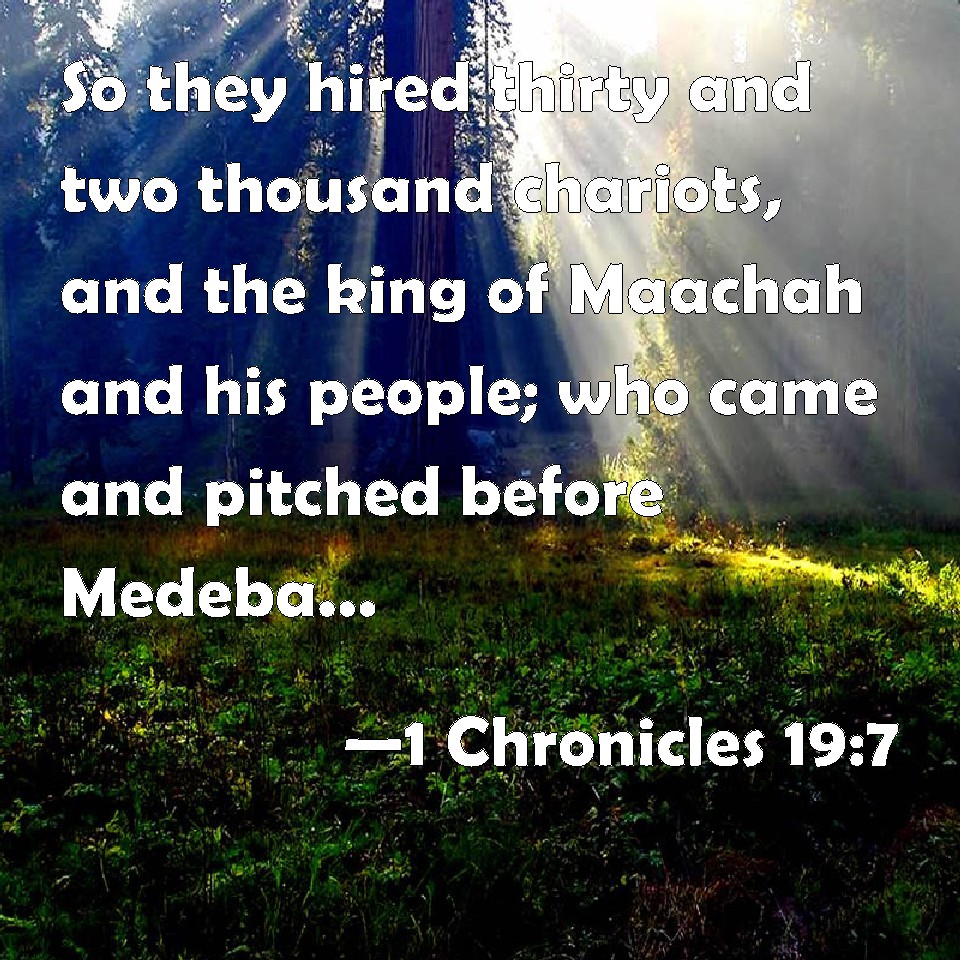 Choose a Background 1 Chronicles 19:7 So they hired thirty and two thousand chariots, and the king of Maachah and his people; who came and pitched before Medeba. And the children of Ammon gathered themselves together from their cities, and came to battle. KJV: So they hired thirty and two thousand chariots, and the king of Maachah and his people; who came and pitched before Medeba. And the children of Ammon gathered themselves together from their cities, and came to battle. DRB: And they hired two and thirty thousand chariots, and the king of Maacha, with his people. And they came and camped over against Medaba. And the children of Ammon gathered themselves together out of their cities, and came to battle. DBT: And they hired thirty-two thousand chariots, and the king of Maacah and his people; and they came and encamped before Medeba. And the children of Ammon gathered together from their cities, and came to battle. ERV: So they hired them thirty and two thousand chariots, and the king of Maacah and his people; who came and pitched before Medeba. And the children of Ammon gathered themselves together from their cites, and came to battle. WBT: So they hired thirty and two thousand chariots, and the king of Maachah and his people, who came and encamped before Medeba. And the children of Ammon assembled from their cities, and came to battle. WEB: So they hired for themselves thirty-two thousand chariots, and the king of Maacah and his people, who came and encamped before Medeba. The children of Ammon gathered themselves together from their cities, and came to battle. YLT: and they hire to them two and thirty thousand chariots, and the king of Maachah and his people, and they come in and encamp before Medeba, and the sons of Ammon have been gathered out of their cities, and come in to the battle.Links 1 Chronicles 19:7 NIV • 1 Chronicles 19:7 NLT • 1 Chronicles 19:7 ESV • 1 Chronicles 19:7 NASB • 1 Chronicles 19:7 KJV • 1 Chronicles 19:7 Interlinear • 1 Chronicles 19:7 Commentaries • 1 Chronicles 19:7 Parallel Texts • 1 Chronicles 19:7 Bible Apps • 1 Chronicles 19:7 Parallel • Bible Hub |