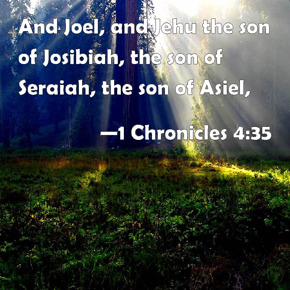 Choose a Background 1 Chronicles 4:35 And Joel, and Jehu the son of Josibiah, the son of Seraiah, the son of Asiel, KJV: And Joel, and Jehu the son of Josibiah, the son of Seraiah, the son of Asiel, DRB: And Joel, and Jehu the son of Josabia the son of Saraia, the son of Asiel, DBT: and Joel, and Jehu the son of Josibiah, the son of Seraiah, the son of Asiel, ERV: and Joel, and Jehu the son of Joshibiah, the son of Seraiah, the son of Asiel; WBT: And Joel, and Jehu the son of Josibiah, the son of Seraiah, the son of Asiel, WEB: and Joel, and Jehu the son of Joshibiah, the son of Seraiah, the son of Asiel, YLT: and Joel, and Jehu son of Josibiah, son of Seraiah, son of Asiel,Links 1 Chronicles 4:35 NIV • 1 Chronicles 4:35 NLT • 1 Chronicles 4:35 ESV • 1 Chronicles 4:35 NASB • 1 Chronicles 4:35 KJV • 1 Chronicles 4:35 Interlinear • 1 Chronicles 4:35 Commentaries • 1 Chronicles 4:35 Parallel Texts • 1 Chronicles 4:35 Bible Apps • 1 Chronicles 4:35 Parallel • Bible Hub |